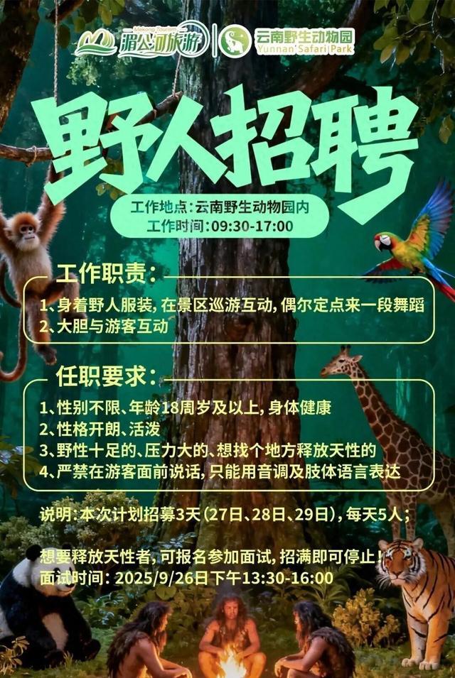 9月24日,云南野生动物园微信公众号发布“野人”招聘信息,招聘人数为5人,性别不限,年龄18周岁以上,工作时间为9点30分至17点。
