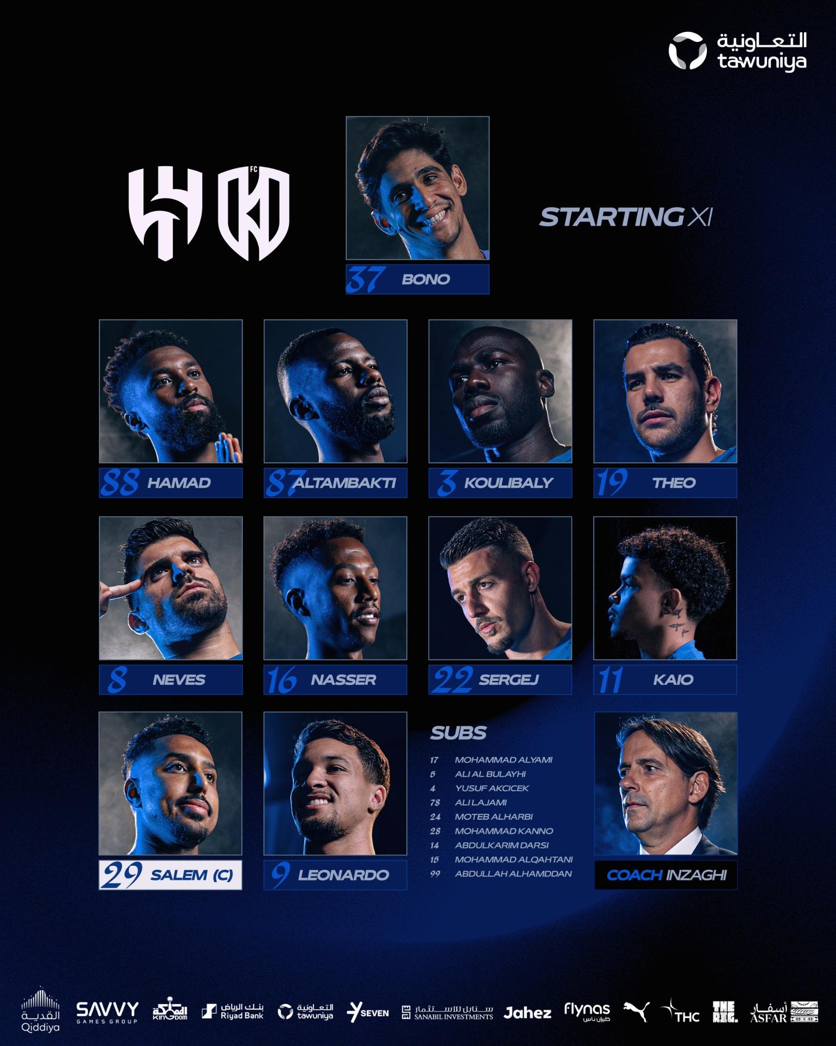 新月首发:37-布努、88-哈马德、5-阿尔坦巴克蒂、3-库利巴利、19-特奥、8-内维斯、16-纳斯尔、22-米林科维奇-萨维奇、10-凯奥、29-多萨里、9-莱昂纳多
