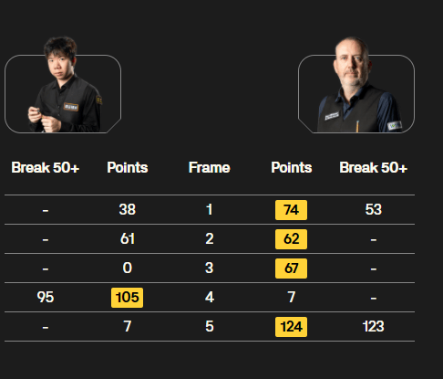 全场比赛,马克-威廉姆斯打出一杆破百(123)和一杆50+(53),雷佩凡打出一杆50+(95)。