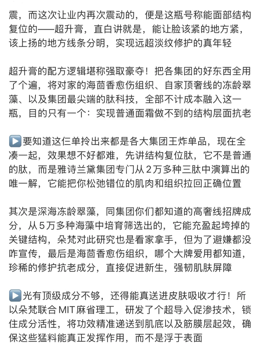 超升膏的配方逻辑堪称强取豪夺!把各集团的好东西全用了个遍,将对家的海茴香愈伤组织、自家顶奢线的冻龄翠藻、以及集团最尖端的肽科技,全部不计成本融入这一瓶,目的只有一个:实现普通面霜做不到的结构层面抗老