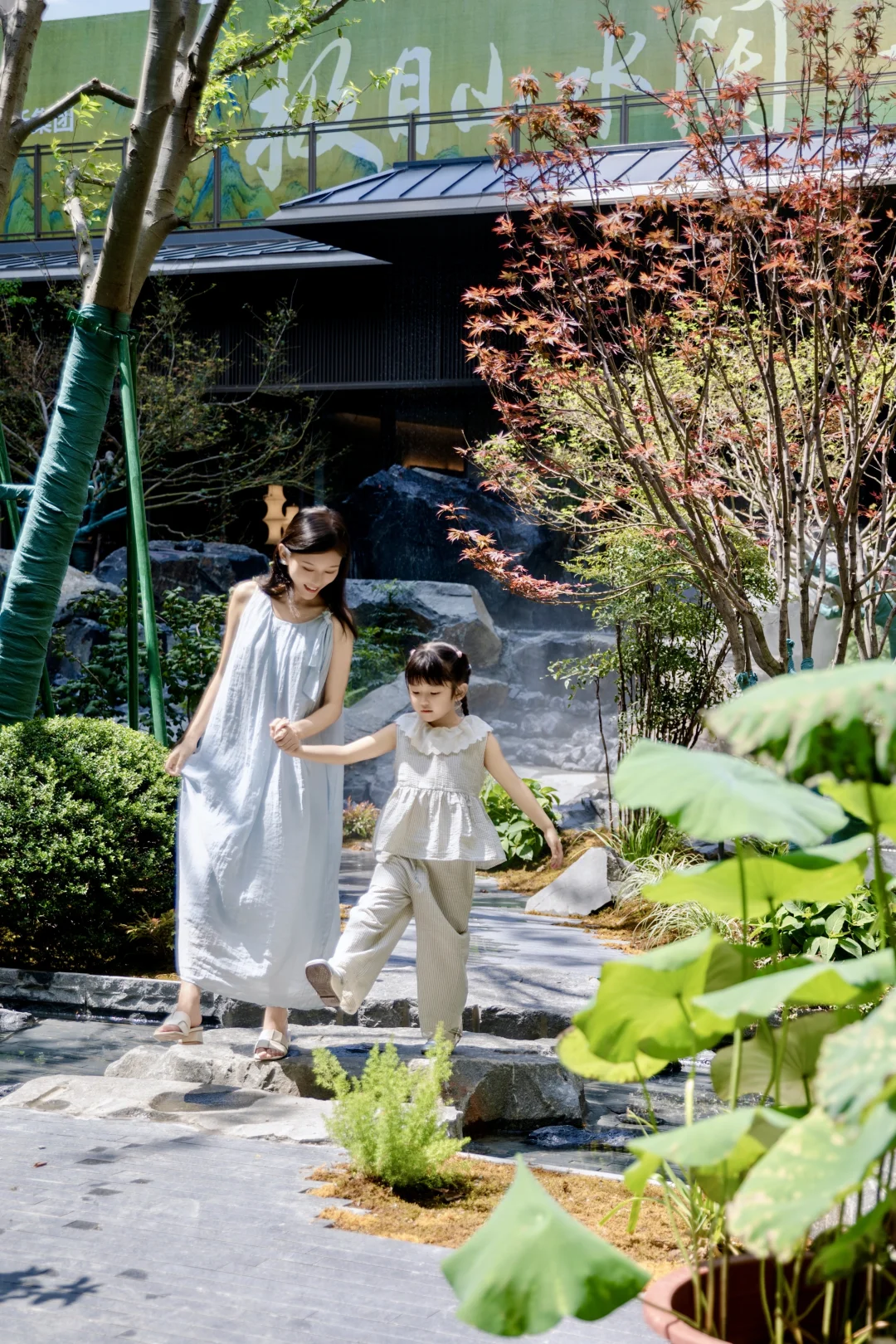 一进小区,下沉庭院像藏在市中心的秘密花园,绿树绕着石板路,牵着娃慢慢走,听他叽叽喳喳说树叶的形状,静谧里全是亲子时光的软意。