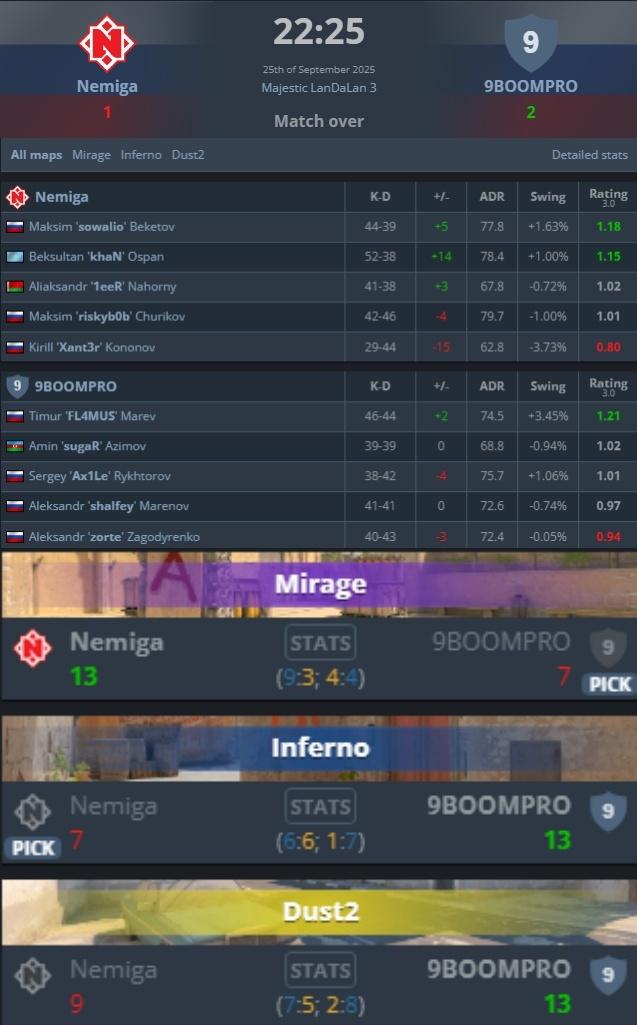 另外一边由FL4MUS、Ax1Le、zorte等人组成的俄罗斯替补天团9BOOMPRO也完成了线下首秀,他们在MajesticLanDaLan3赛事小组赛首轮中让一追二逆转Nemiga取得开门红。FL4MUS在决胜图Dust2中轰出20杀1.51rating成为逆转功臣!