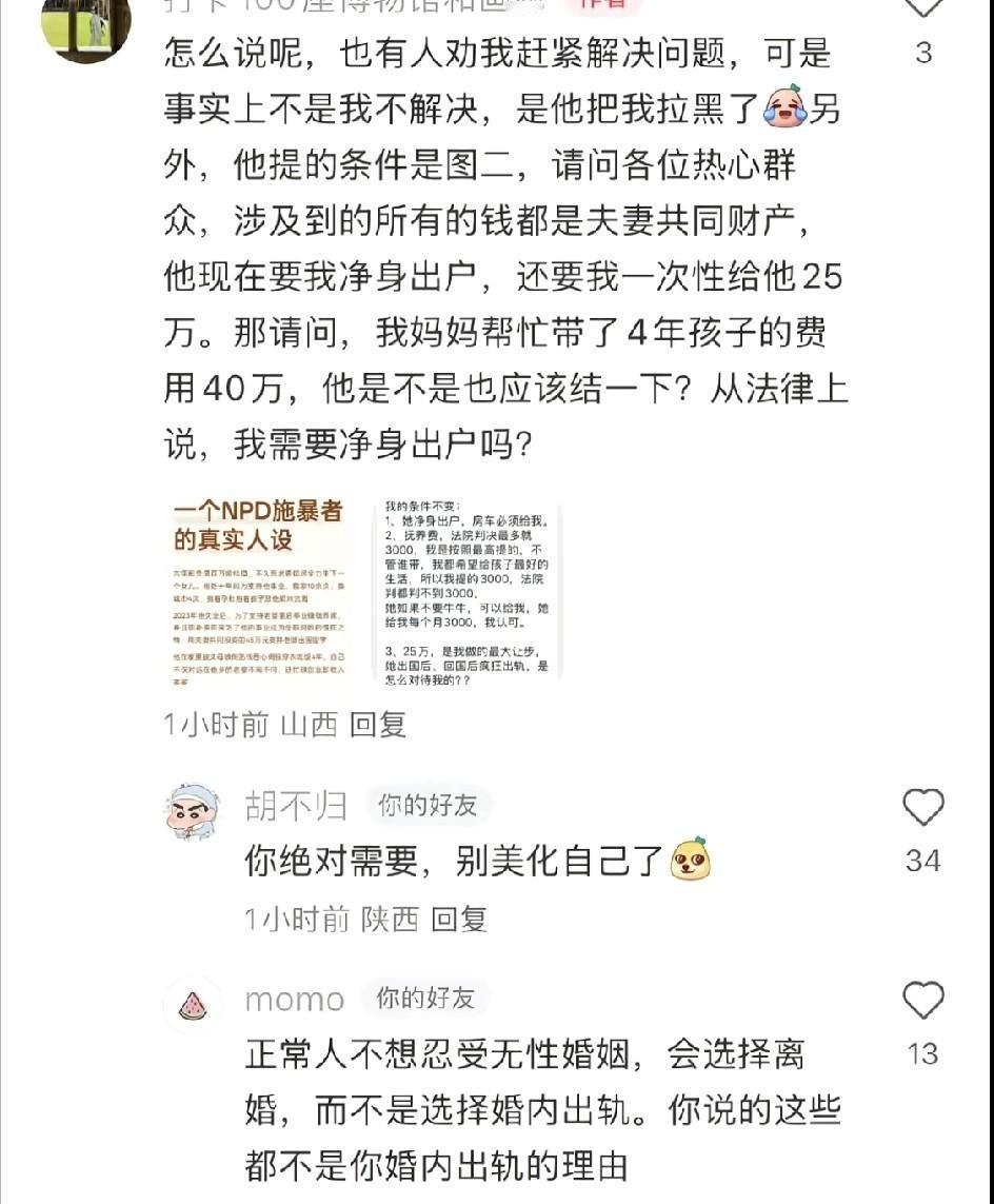 男子68页PPT曝妻子出轨华南理工博士,网友评论不一,最无辜的是谁?? 一、支持男方观点 黄某兴作为公派留学生,享受国家资助,却做出违背道德知三当三的行为,学校应该严处,觉得校方做出留校察看处分太轻。支持男方维权,卖房支持妻子留学,结果被背叛。女方如果对男方没有感情可以申请离婚,而不是婚内出轨。 二、支持女方观点 丈夫公开妻子隐私不合法,PPT里大量私密照片,涉嫌侵犯隐私权。婚姻出现问题是双方的,不应该一味指责女方。如此详细的记录,男方是否早有预谋?是否另有目的? 三、中立理性分析 女方婚内出轨是属于道德层面问题,男方网络曝光属于法律层面问题,可能涉嫌侵权。 男方的行为是杀敌一千,自伤八百,对自己和家人未来的生活也会有所影响。 作为公派留学生,黄某兴享受国家资助却发生不当关系,违背了《公派留学人员道德规范》中"爱国守法、品德优良"的基本要求。根据《普通高等学校学生管理规定》,高校有权对违反校规校纪的学生进行纪律处分。华南理工大学对涉事博士生黄某兴作出留校察看处分,属于学校自主管理权的合理行使。留校察看是介于警告和开除之间的中等程度处分,适用于情节较重但未达到开除程度的行为。考虑到黄某兴的行为虽违反道德规范但未构成犯罪,校方处理在法律框架内具有合理性。 当前男方和女方进行了离婚谈判,且陷入了僵局。 男方认为女方作为过错方,必须净身出户,还需赔偿卖房子供她留学的钱。 女方则认为房子是夫妻共同财产,男方自愿卖房支持留学,无需赔付。还认为自己母亲照顾孩子4年,男方需要支付照顾孩子的费用40万。 个人推测离婚大概是必须了,至于财产分割,谈判不成或许会诉诸于法律来解决。而女方最终能否跟黄某兴走到一起,还未可知!毕竟当初男方和女方是认识4年才结婚生女,婚后第5年出国留学出轨,让时间来验证这一切。而黄某兴收到学校处分后,或许还会影响个人的学业和工作。最无辜的是男女双方的亲人,尤其的女儿伤害至深,自己的父母对簿网络甚至对簿公堂,人生观价值观也会深受影响。