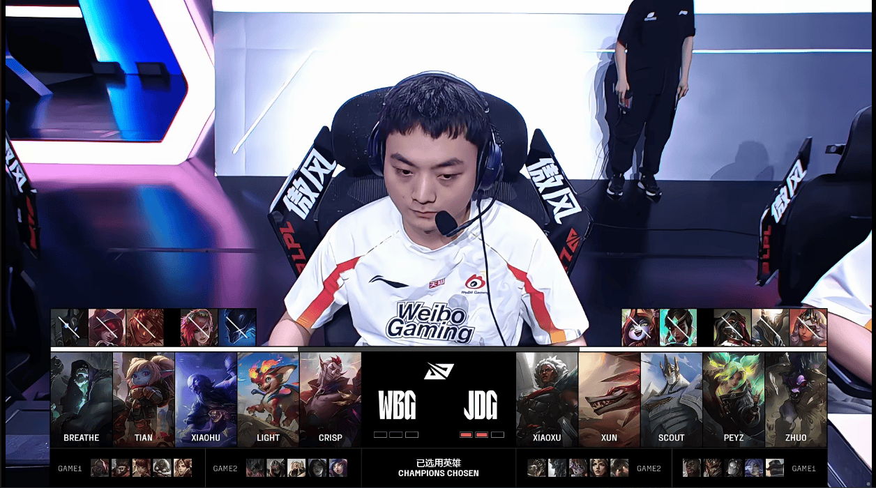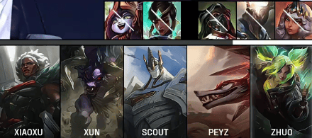JDG选用:Xiaoxu狼母;Xun纳亚菲利;Scout加里奥;Peyz泽丽;Zhuo牛头
