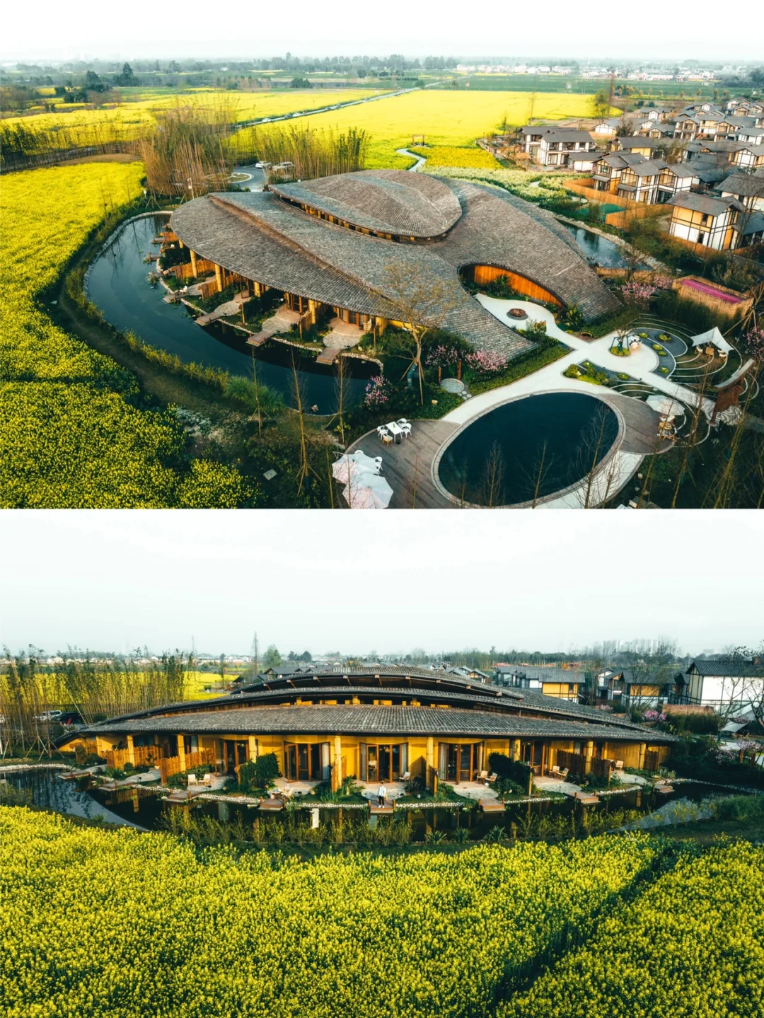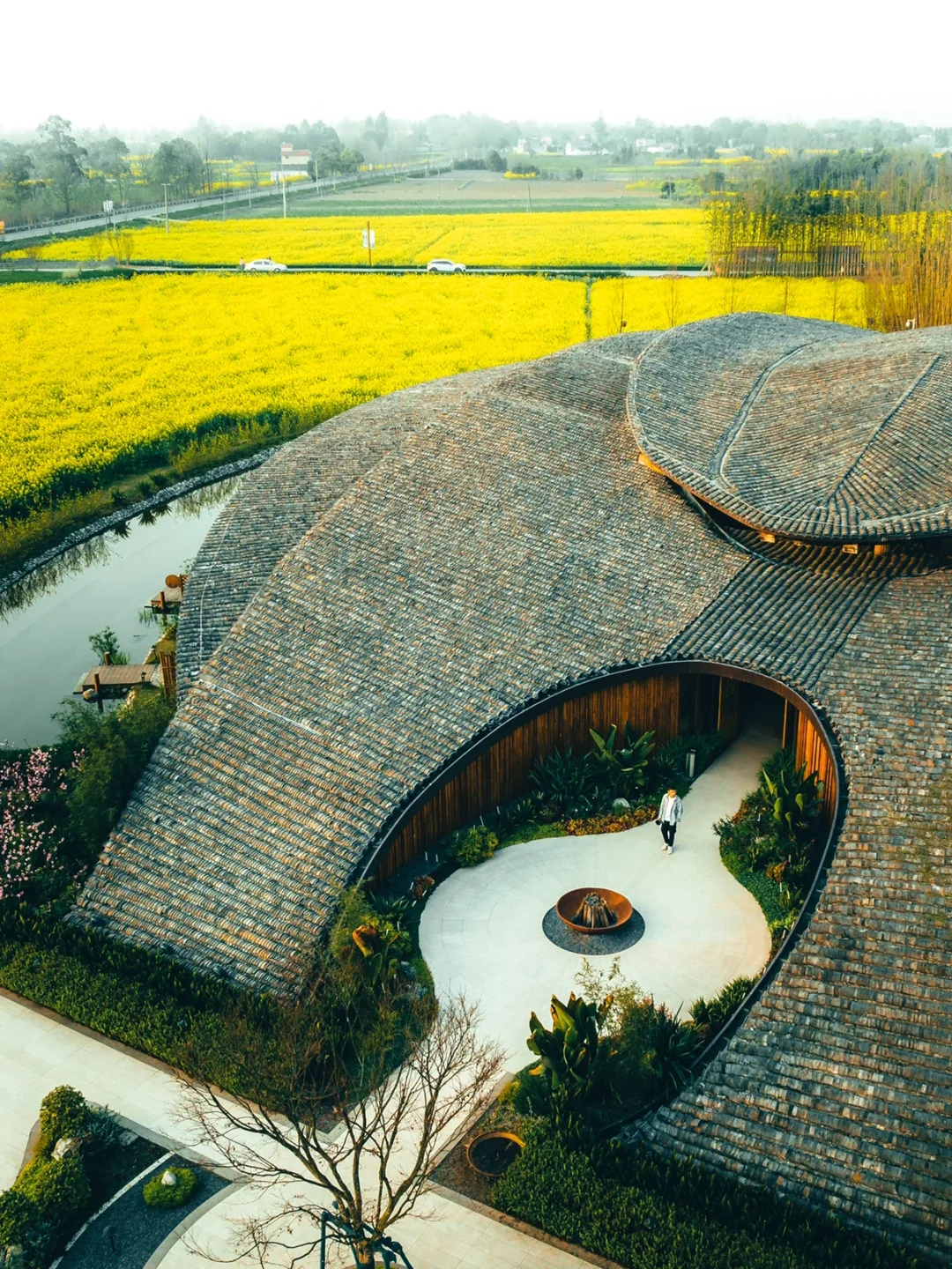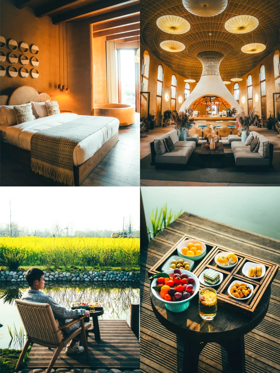 🌾酒店建在15000亩的稻乡渔歌景区里,被田园、花海包围,这里有如画的风景,不论从空中俯瞰,还是从内部观察,这是一座民宿,更是一座艺术品。