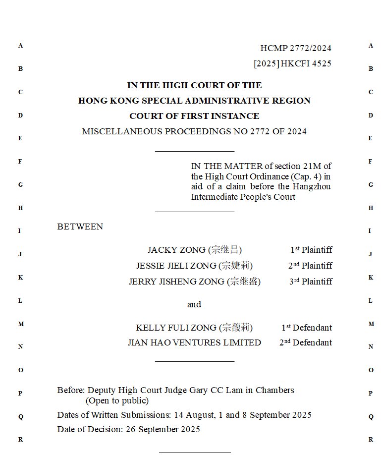 香港高等法院上月颁下非正式禁制令,禁制宗馥莉从一个与遗产有关的银行户口提取资产,直到内地法院有裁决,并要披露账户完整账目及资金去向。