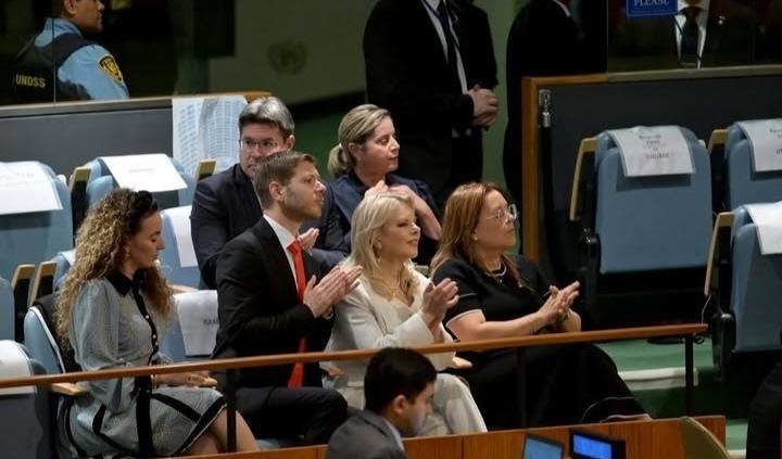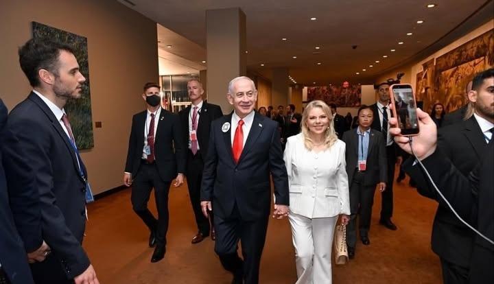 内塔尼亚胡的妻子萨拉在社交平台晒两人在联合国大会的照片。 配文说,“陪同我的丈夫
