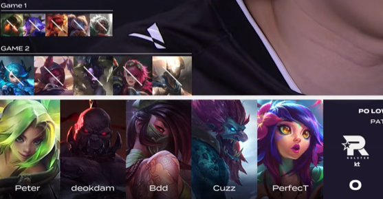 KT选用:Perfect赛恩、Cuzz巨魔、Bdd阿卡丽、deokdam泽丽、Peter妮蔻