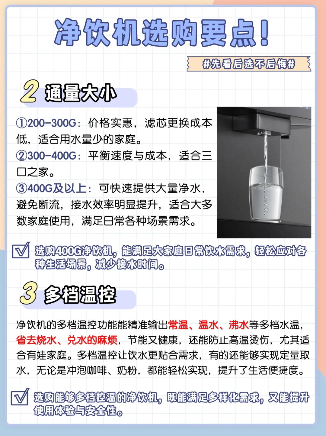 首选大通量,400G及以上能满足大家庭日常饮水需求,轻松应对各种生活场景,减少接水时间。