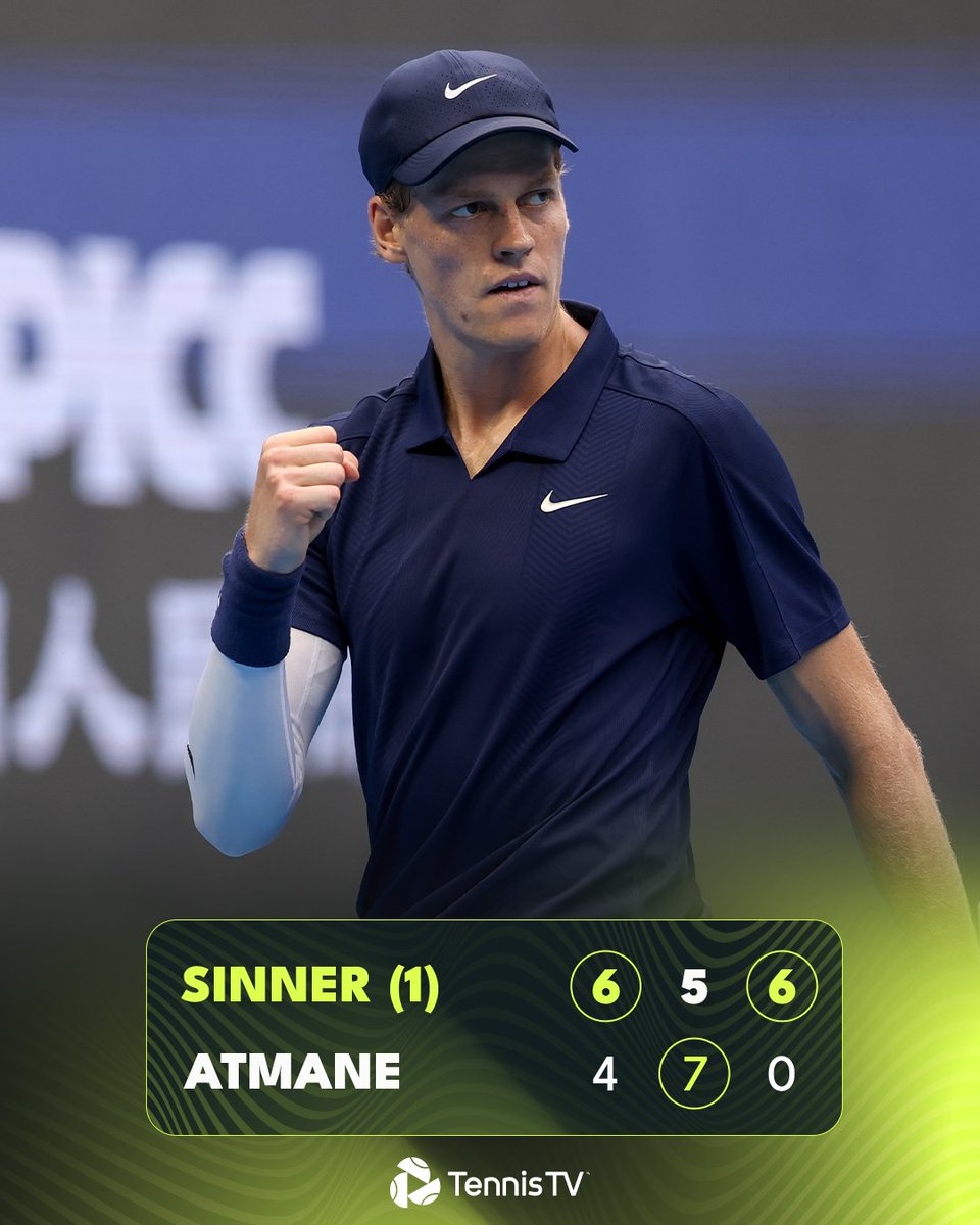 TennisTV(网球)发推报道,扬尼克·辛在一场精彩的比赛中战胜阿特马内,连续第13次闯入硬地赛事八强#中国公开赛