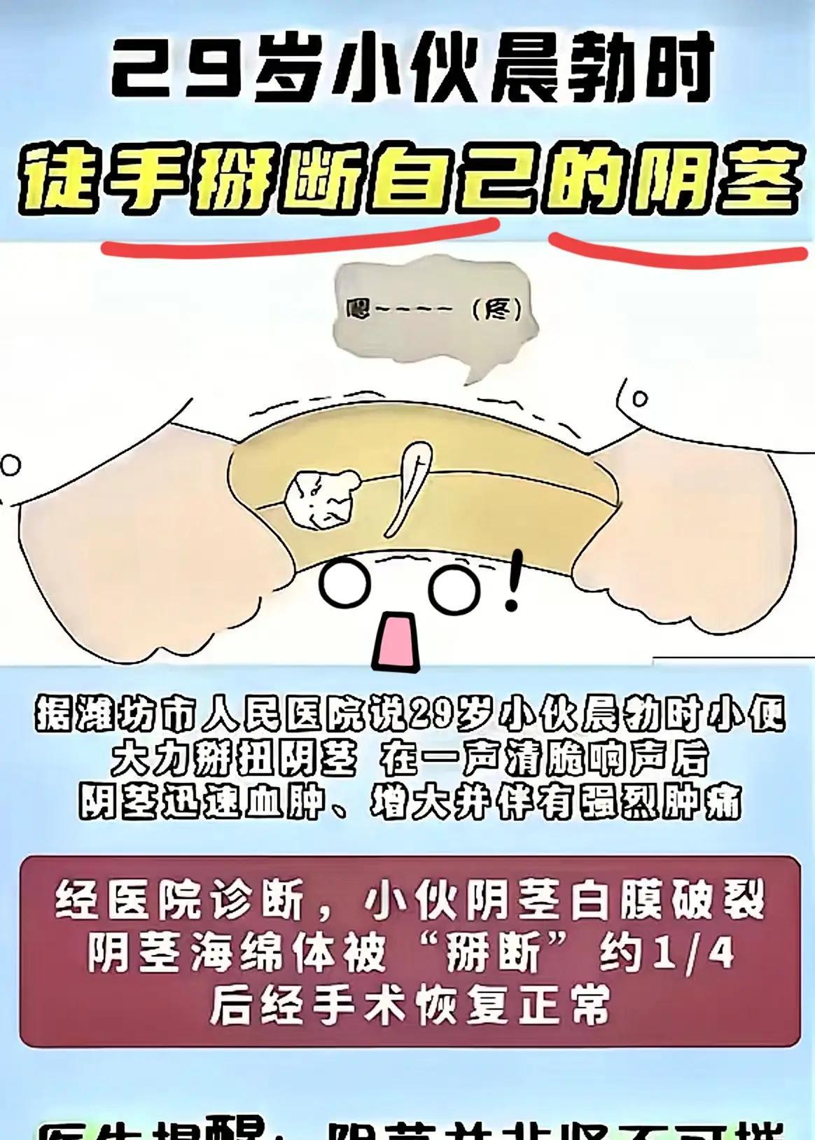 这小伙为何会对自己的生殖器下这般狠手! 实在令人费解,潍坊有个29岁的青年,就因为晨勃,也不知怎的,竟生生徒手把自己的阴茎掰断了。 有网友调侃,说他或许是想练《葵花宝典》。 还有网友称,可能他到29岁这器官还没真正派上用场,就以为它没用了。 玩笑归玩笑,这东西硬起来如铁,却并非无坚不摧,万一使用不当,很容易断裂。连着生殖器下方的一根筋极为重要,没它管束,生殖器就会不听指挥、没了方向感。 所以男同志还是要善待自己的“小弟”,让它工作时别太累,动作也别太夸张、用力过猛,以免造成不必要的损伤。#阴茎延长手术# #生殖器官# #阴茎血管# #阴茎粗细# #活拔男人# #丁丁标本# #生殖器再造手术# #生殖器切断#