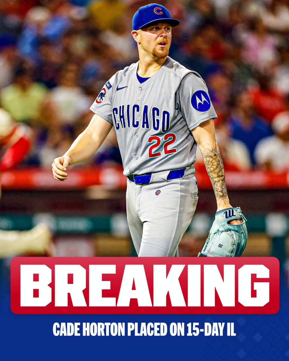 记者MLB官方X账号发推特报道,小熊队将右投手凯德·霍顿列入15天伤病名单,原因是右侧肋骨骨折。