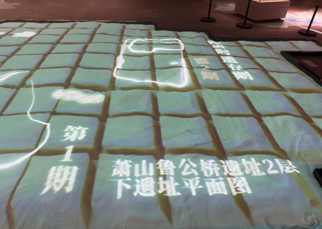在“发现杭州”,另一处别有洞天的沙池用光影还原了衣锦城遗址的样貌,灰色的沙粒堆出东城墙的轮廓,圆弧形的东南城隅清晰可见,细小的蓝色砂砾模拟出锦溪与苕溪的走向,沿着城墙内侧延伸的“排水沟”,正是刘青彬团队2024年底发现青瓷的关键区域。