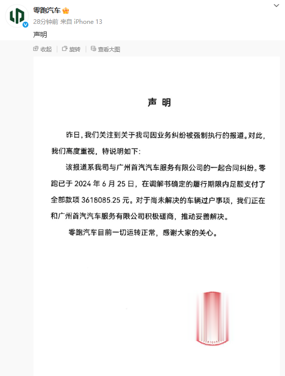 零跑汽车表示,该事件系公司与广州首汽汽车服务有限公司的一起合同纠纷,零跑已于2024年6月25日,在调解书确定的履行期限内足额支付了全部款项3618085.25元。