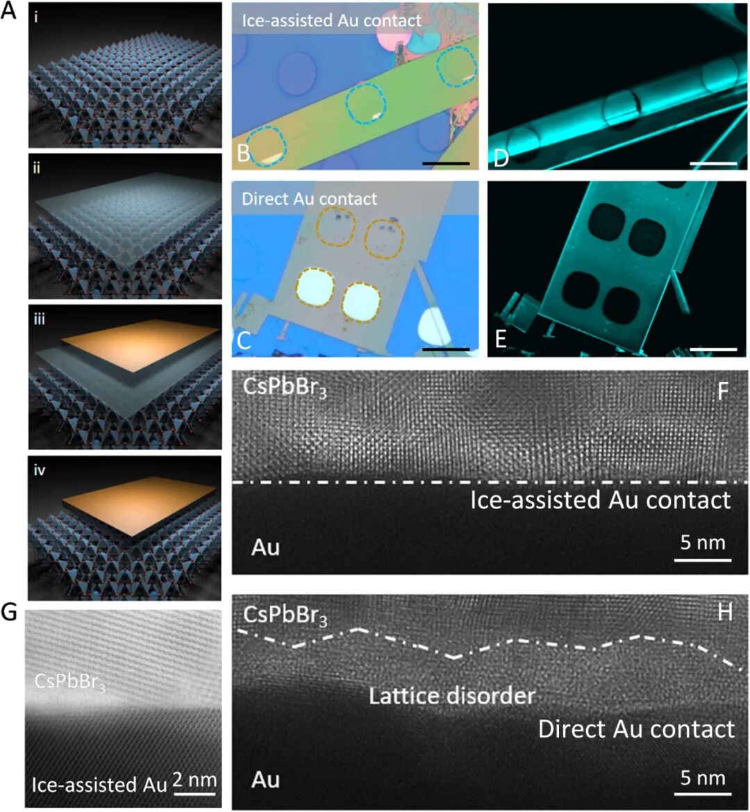 研究团队在前期冰刻技术的基础上,利用水冰与钙钛矿的优异兼容性,开发了全新的冰辅助制备范德华接触方法,核心步骤包括:(1)样品降温&水冰沉积:将附有掩模的钙钛矿薄膜冷却至约120K,原位沉积水冰缓冲层;(2)金属蒸镀:在冰层上沉积金属电极;(3)冰升华&金属软着陆:复温使冰层直接升华(无液态水生成),金属电极软着陆于钙钛矿表面,形成原子级清洁的范德华界面。表征结果显示,冰沉积-升华过程不会改变钙钛矿的晶体结构和化学组成,同时钙钛矿-电极界面中无残留水空隙。