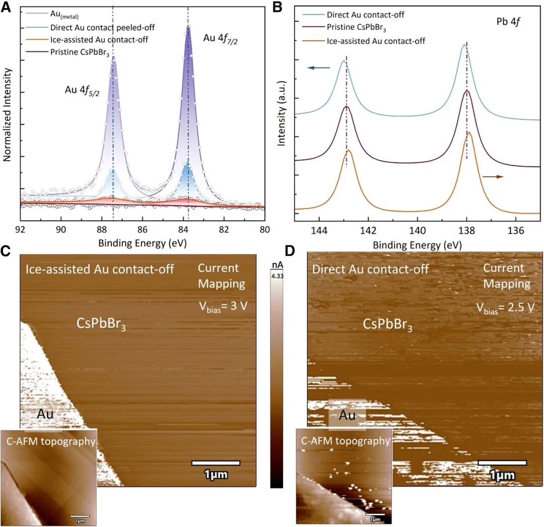 图2.基于直接金属沉积和冰辅助金属沉积的CsPbBr3-Au接触区域的化学性质