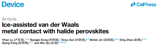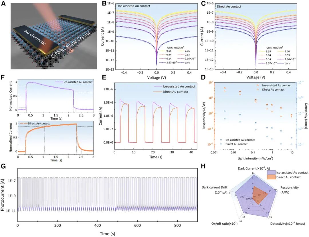 近期,西湖大学工学院仇旻团队开发了一种新型的冰辅助实现范德华金属接触技术,成功解决了卤化物钙钛矿器件在电极制备过程中的一大难题。由于钙钛矿具有“软晶格”特性,传统电极制备工艺容易在电极-钙钛矿界面处引入缺陷,严重影响载流子传输。该团队创新性地引入水冰作为缓冲层,其在金属沉积过程中能够有效保护钙钛矿表面,之后通过自然复温使冰层完全升华,即可实现金属电极与钙钛矿的无损接触。基于这一策略制备的钙钛矿光电探测器,性能得到了显著提升:暗电流在0.1V偏压下低至69.7pA,较传统方法制备的器件降低一个数量级;同时,在450nm蓝光激发下,器件实现了2.4×105的超高开关比,并在弱光条件下仍保持42.1A/W的高响应率。这项研究为高性能钙钛矿光电器件的研发提供了全新思路。相关研究成果以《Ice-assistedvanderWaalsMetalContactwithHalidePerovskites》为题,发表于CellPress期刊《Device》。