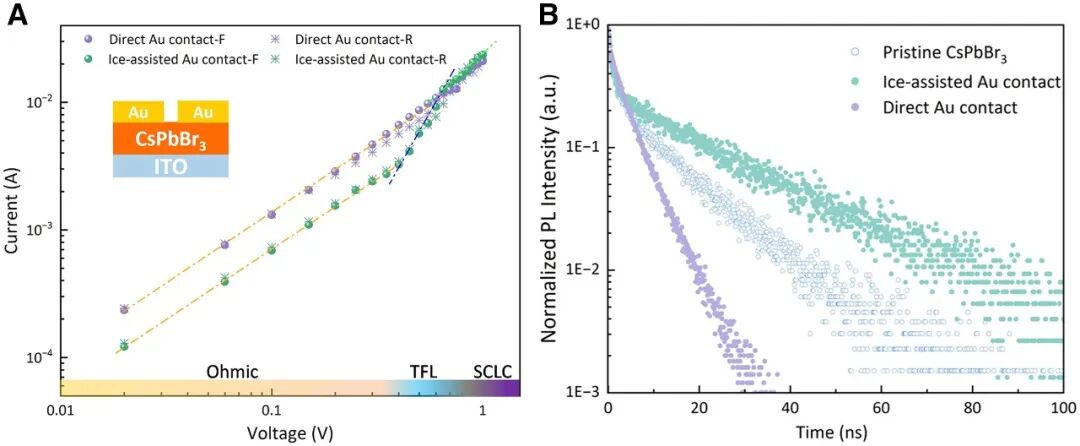 为评估冰辅助策略对钙钛矿缺陷的抑制效果,团队通过脉冲空间电荷限制电流(pulsed-SCLC)分析量化缺陷密度。结果显示,冰辅助Au接触器件填充限制电压较低,对应陷阱密度显著降低,而直接Au接触器件在测试电压范围内未实现从陷阱填充到无陷阱区的过渡,印证了冰辅助方法对晶格无序和缺陷的显著抑制;同时,还通过微区时间分辨光致发光(TRPL)光谱表征了不同接触下CsPbBr3的载流子复合行为,进一步显示,冰辅助接触的CsPbBr3平均载流子寿命大幅延长,有效抑制缺陷态导致的非辐射复合。