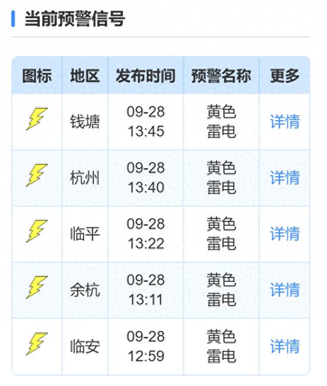 截至13:50,钱塘、杭州、临平、余杭、临安发布雷电黄色预警。
