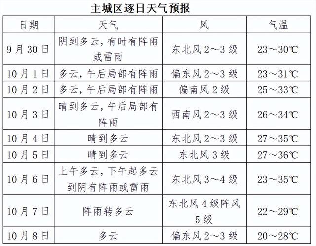 国庆假期气象条件总体利于外出旅游,其中9月29-30日、10月6-7日有明显阵雨或雷雨,需防范局地短时强降雨对交通出行、旅游安全等的不利影响。