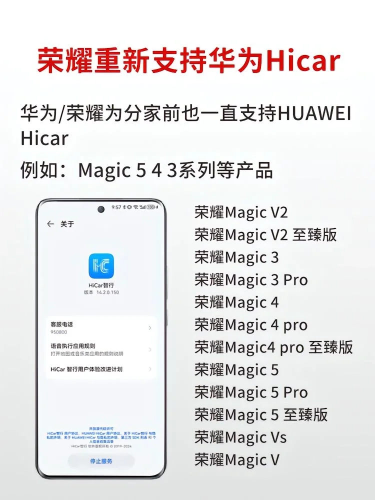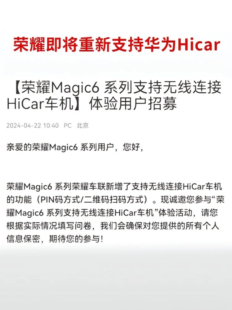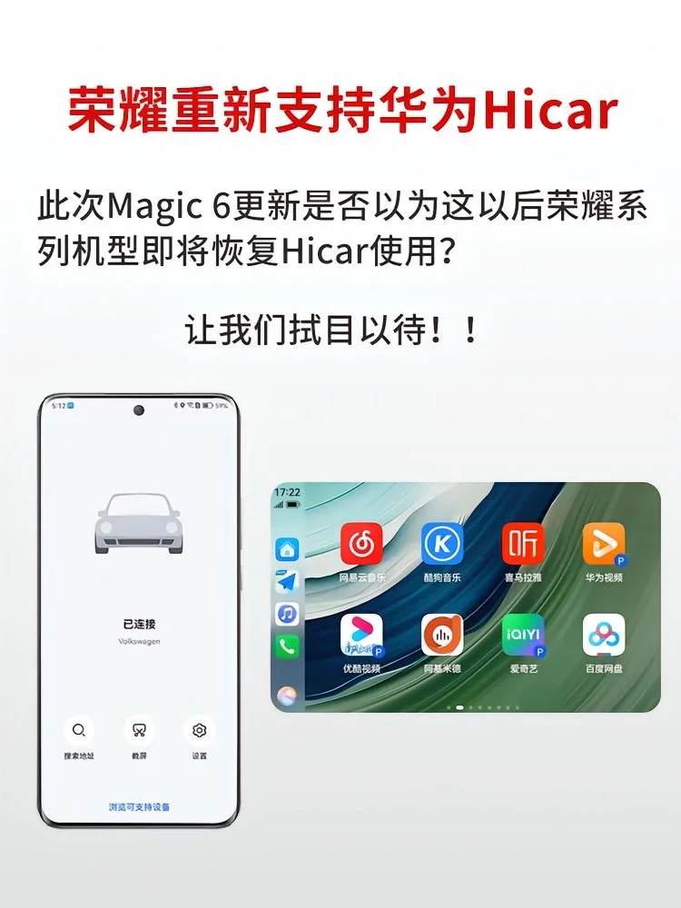 据网友反馈,荣耀新系统重新回归华为Hicar车机功能,经验证Magic 6系列已经支持最新版Hicar车机系统,之前虽然Magic5、4也支持,但一直无法更新!此次M6的更新是否意味着从此以后荣耀将重回Hicar行列?