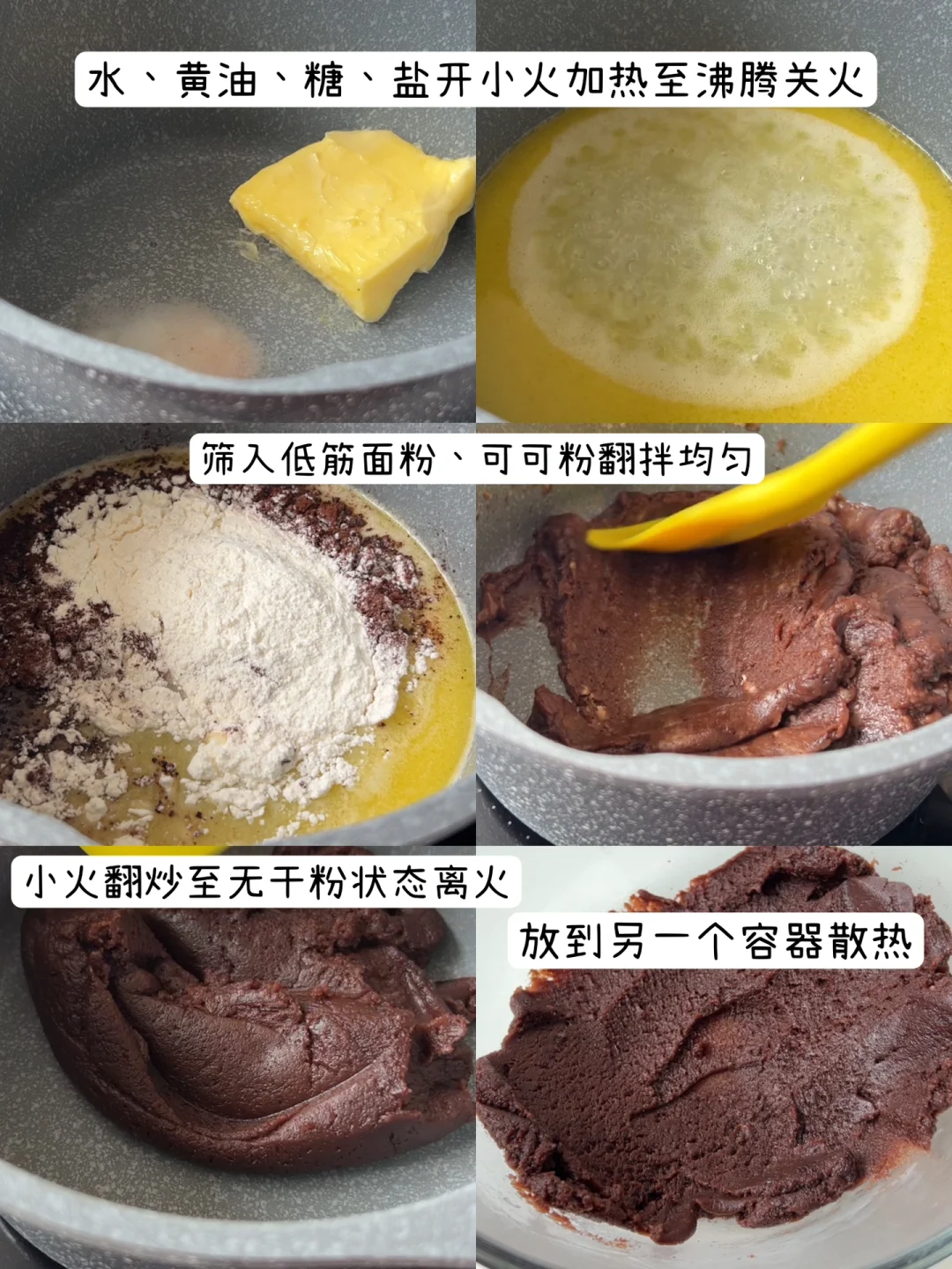 1⃣️将材料中的水、黄油、细砂糖、盐放入锅中,中小火煮沸,关火。加入低筋面粉、可可粉混合,翻拌均匀