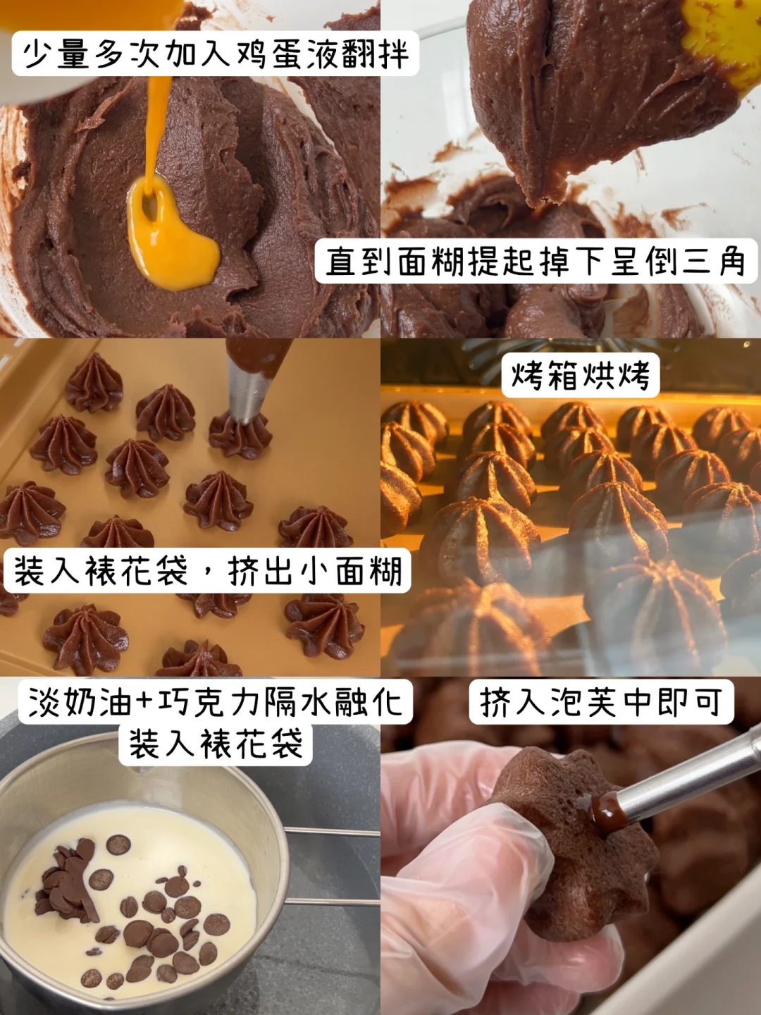 6⃣️烤好后,取出泡芙,用筷子在底部或者侧面戳个洞,挤入巧克力酱
