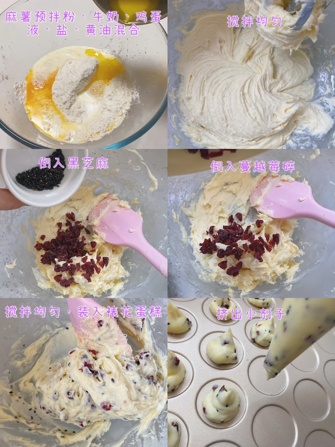 麻薯预拌粉100g、牛奶90g、全蛋液15g、盐1g、黄油35g、蔓越莓干25g、黑芝麻3g