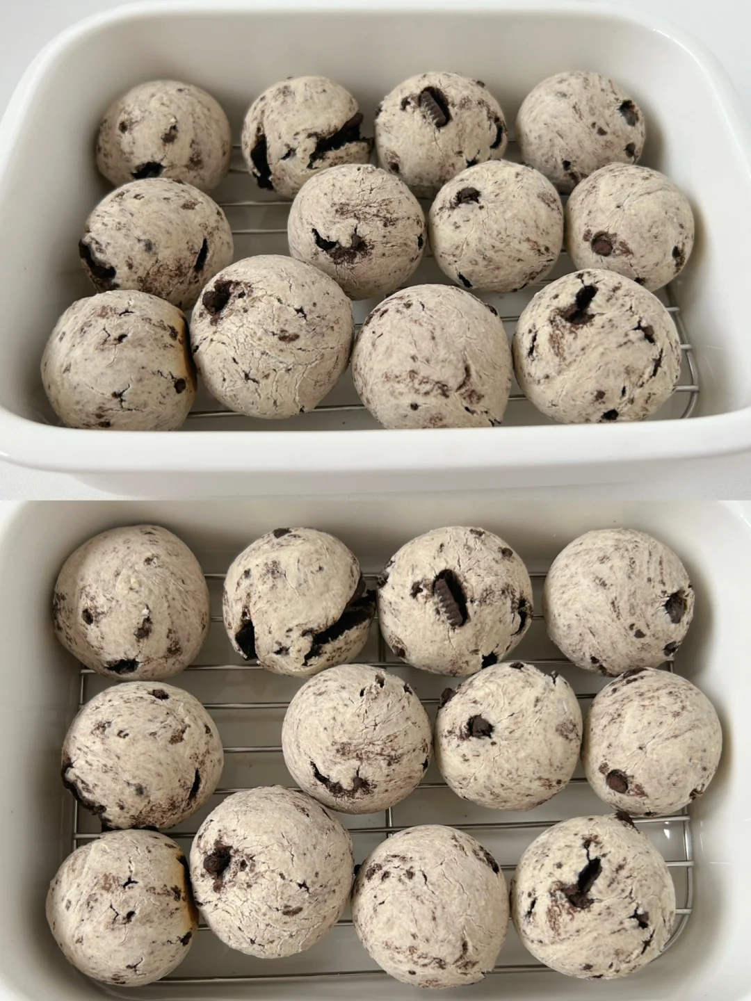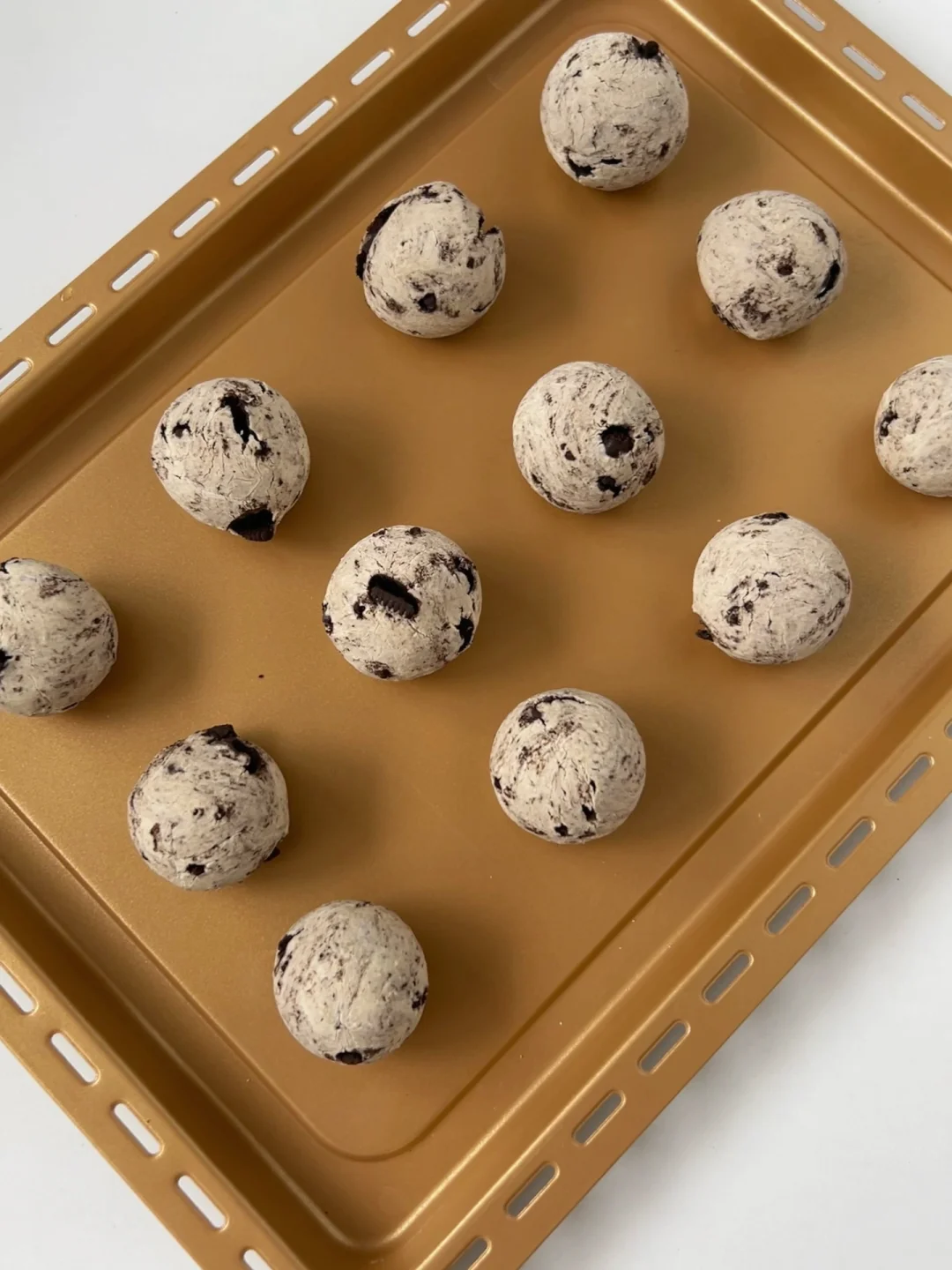 3⃣️倒入奥利奥碎揉均匀,分成25g/个的小球,表面喷一层水