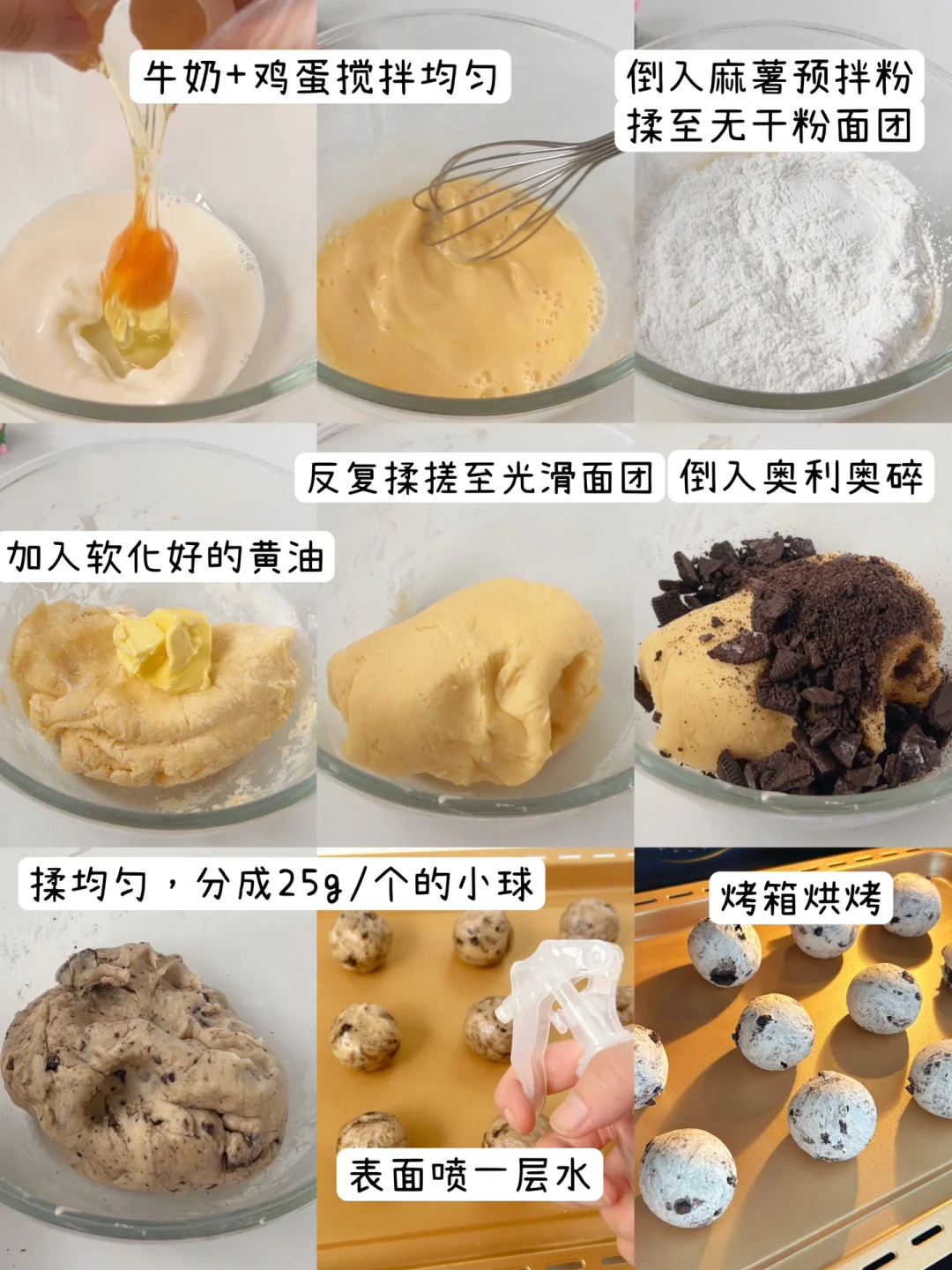 牛奶80g、鸡蛋1个、麻薯预拌粉200g、黄油25g、奥利奥碎20g