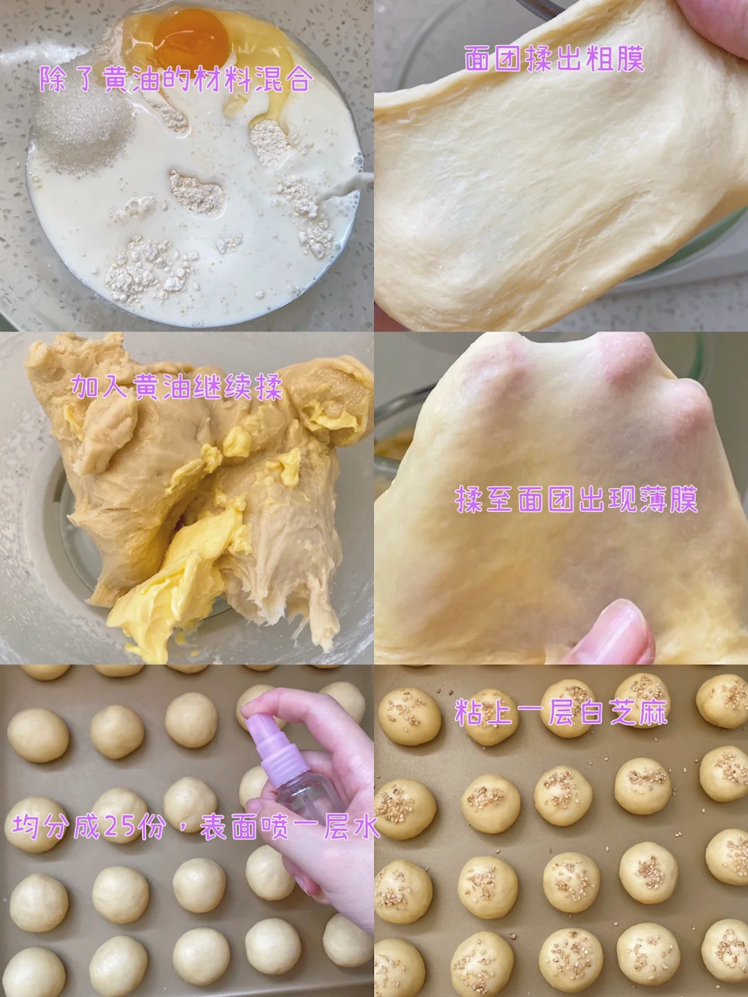 高筋面粉250g、白砂糖30g、鸡蛋1个、干酵母3g、盐2g、冰牛奶120g、黄油25g、白芝麻适量