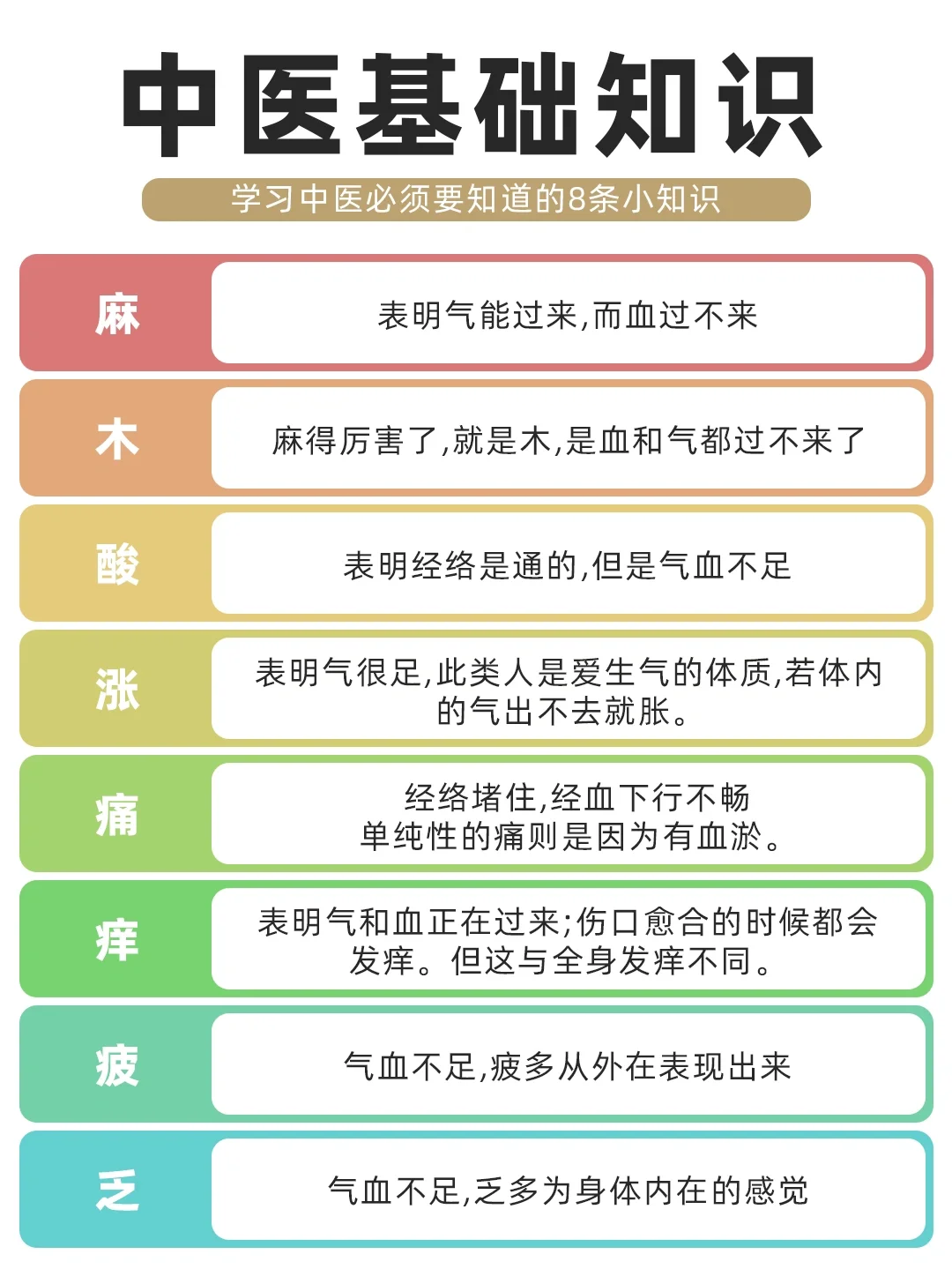 1⃣️脾对口 1.嘴唇淡白——脾胃虚弱。 2.口中反酸-—脾胃不和。 3.口苦口臭——胃火过大。 2⃣️心对舌 1.舌头泛白——心血不足。 2.舌色红发——心有实火。 3.舌下青筋一身体堵淤。 3⃣️肝对目 1.眼睛干涩——肝血不足。 2.眼睛流泪——肝气郁结 3.眼干发红——肝火旺威。 4⃣️肾对耳 1.耳朵泛白——肾气不足。 2.朵耳薄小——肾气亏损。 3.耳朵发黑——阳气不足。 5⃣️肺对鼻 1.鼻子发红——肺部热燥。 2.鼻子血出——肺阴不足。 3.嗅觉不好——肺气不通。 🌟🌟🌟🌟🌟 (1)肝属木,木曰曲直,有生长升发、舒畅条达之性。 肝喜条达而恶抑郁,有疏通气血之功。 (2)心属火,火日炎上,有温热之性。心主血脉以维持体温恒定。 (3)脾属土,土性敦厚,生化万物。脾居中焦,化生气血。 (4)肺属金,金性清肃,收敛肃杀。肺性清肃,以降为顺。 赖同 (5)肾属水,水性滋润、下行闭藏。 肾有藏精、主水之功 (6)肝藏血以济心:木生火心之阳以温脾:火生土脾散精以充肺:土生金肺肃降以助肾:金生水肾藏精以养肝:水生木 (7)肝木之条达以疏泄脾土之壅盛:木克土心之阳热以制肺金肃降之太过:火克金脾主运化以制约肾水之泛滥:土克水肺气肃降以克制肝阳之上亢:金克木肾水上承以制心火之亢烈:水克火