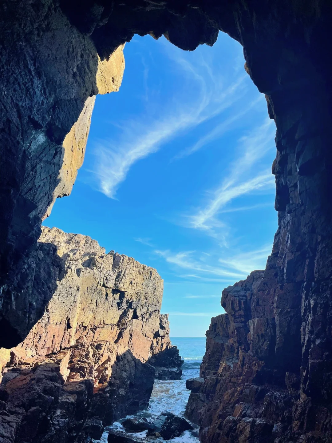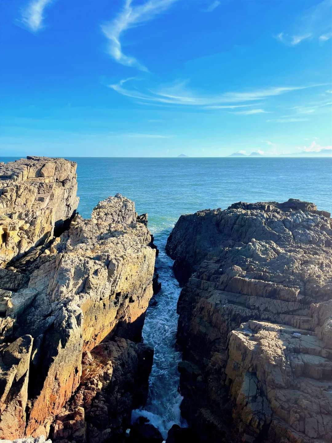 是火山地貌的黑灰色礁石,拥有一线天景观和一处大溶洞景观,大潮水时这儿随处可见海胆,可以在游玩中感受不一样的赶海乐趣。