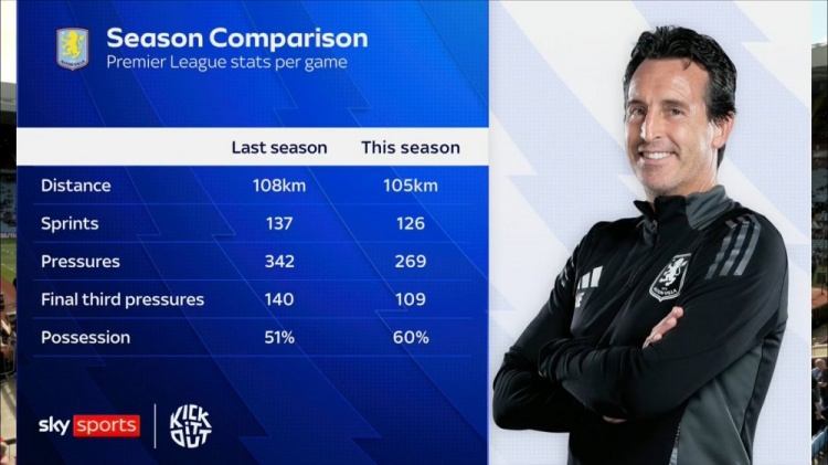 直播吧9月28日讯本赛季英超,维拉0胜3平2负积3分,位居联赛第18位。日前,《天空体育》统计了维拉本赛季与上赛季的联赛场均数据。