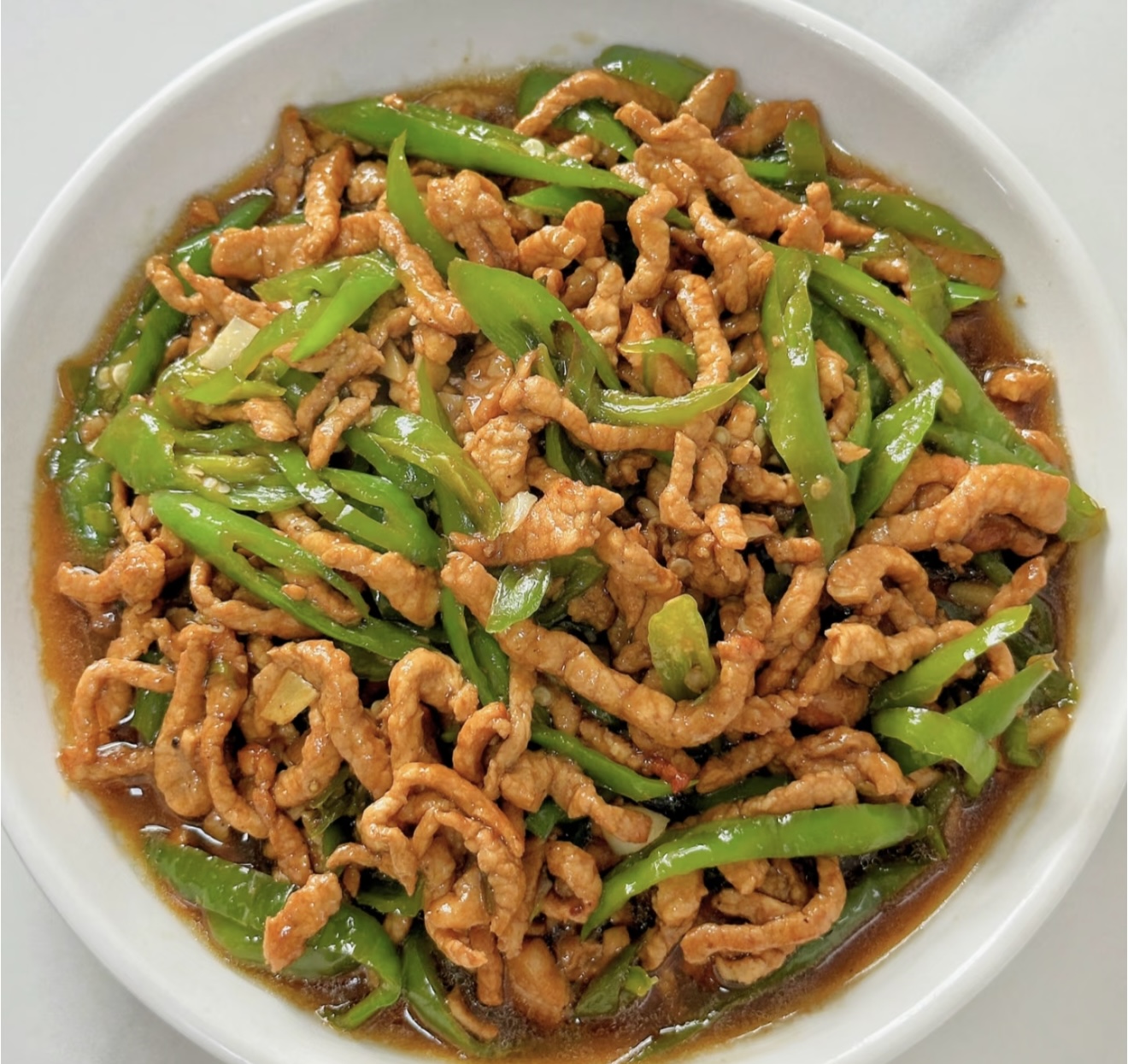 当青椒丝开始变得透亮,炒好的肉丝就该回来合奏了。撒一撮盐,淋半勺蚝油,快速翻炒让调料均匀包裹每根食材。最后淋上薄薄的水淀粉勾芡,让汤汁温柔地包裹住肉丝和青椒,这道菜就有了灵魂。