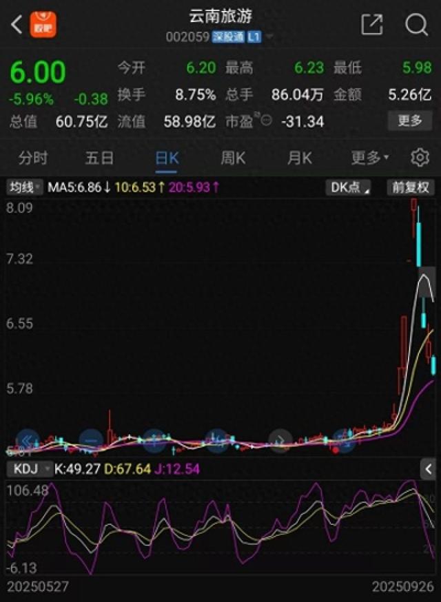 据同花顺统计显示,9月17日至9月25日之间,云南旅游股价连续走出4个涨停,两个跌停,五次登陆龙虎榜,买卖席位前五名中多次出现了“量化打板”“温州帮”“低位挖掘”、拉萨“T王”等知名游资身影。