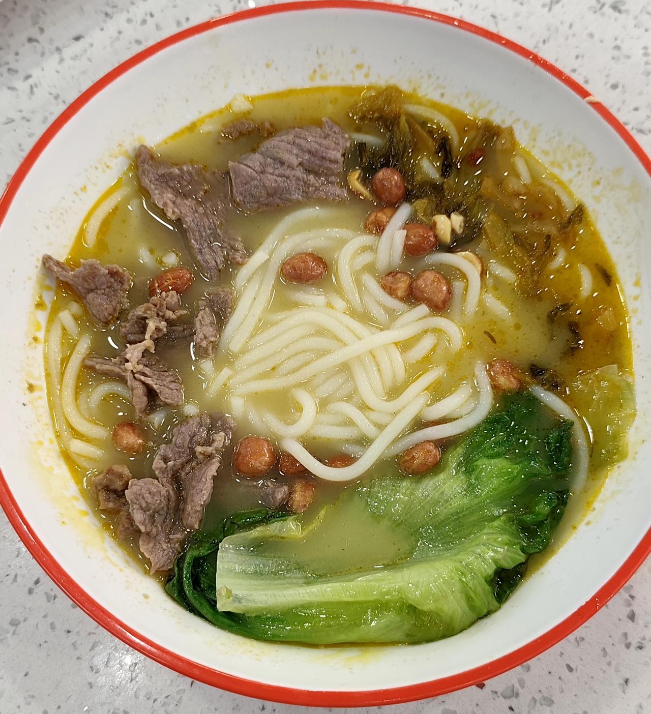 在广州动物园外面有一间华辉拉肠,我点了一碗金汤牛肉米线,吃的时候才知道是麻辣的,
