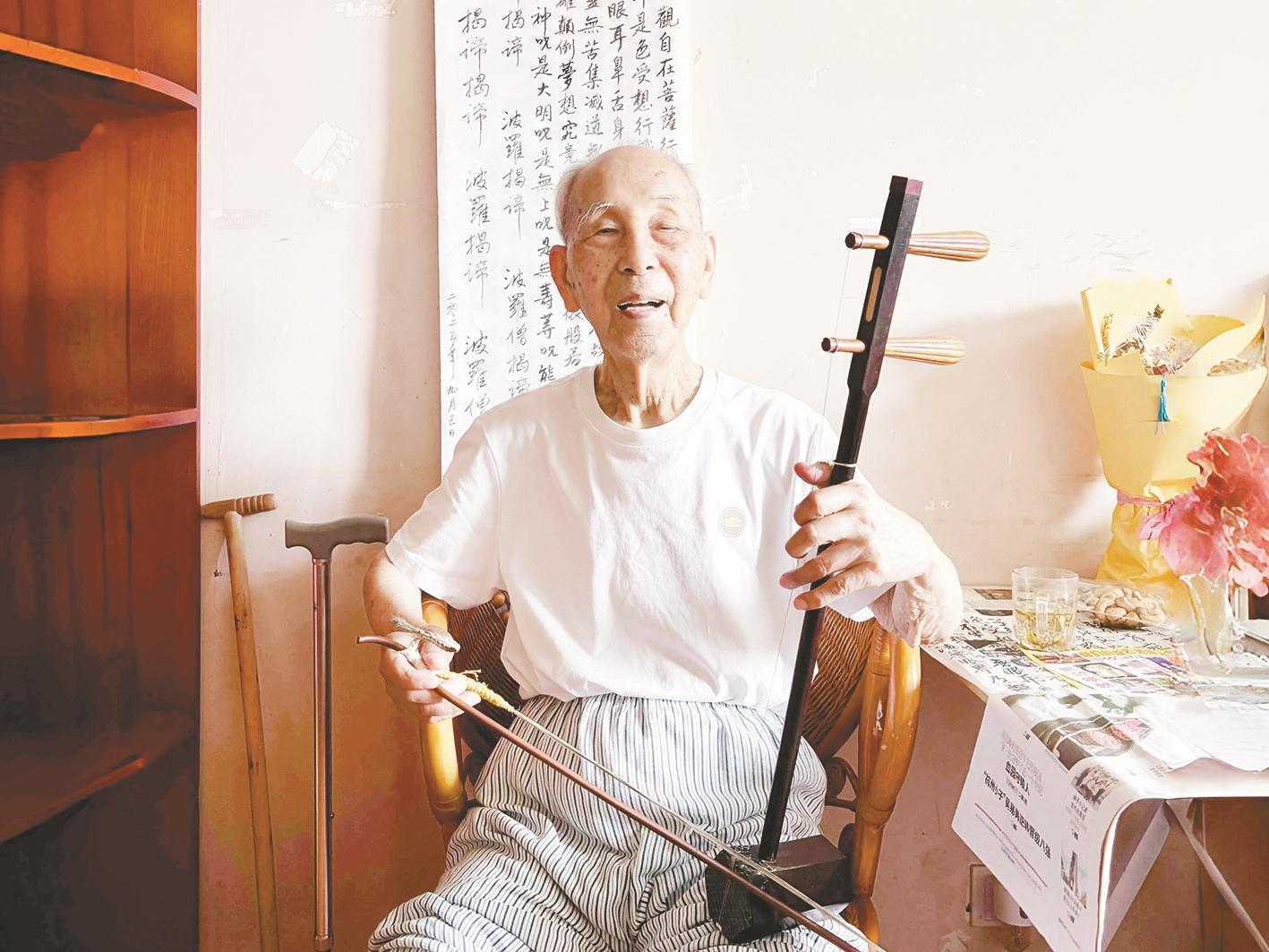走进李爷爷和他儿子的房间,处处透着温馨。两张单人床并排摆放,被子叠得方正整齐;墙上挂着一叠老人的书法作品,笔墨酣畅;电视柜旁,静静倚着两把京胡,其中一把木色温润,琴筒上新修补的蛇皮纹路清晰可见。“这是我刚结婚时买的,也是我人生中的第一把琴。以前常常会拉给孩子们听,转眼间也已经70多年了。”虽已百岁,但李爷爷说话时思路清晰,语速平稳,看上去精气神很足。