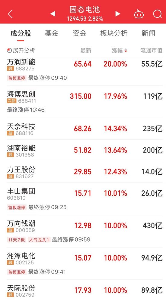 今天上午,固态电池板块大涨,万润新能、海博思创等个股大涨。