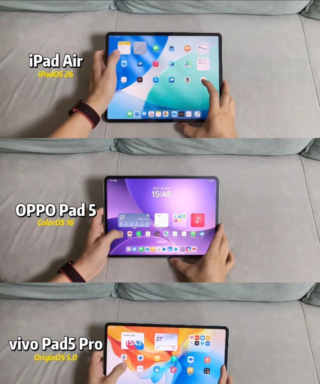 是我的错觉?第一次感觉国产安卓平板流畅点 说出来你可能不信,但确实是事实!! 刚试了下手里头的iPad Air(M3)、OPPO Pad5、vivo Pad5 Pro三台机器, 没想到安卓阵营平板进步这么大 尤其是搭载了ColorOS 16的OPPO Pad5系统动画的调校真挺有意思的, 横竖屏旋转的时候图标居然也会跟着翻转,非常符合视觉直觉。 u1s1,虽然ipad Air的动画很丝滑,但这次在细节上真给安卓平板给追上来了~ 还有就是小窗切换的时候,OPPO Pad5和vivo Pad5 Pro两款安卓平板的动画效果也不输苹果了,OPPO Pad5给我感觉就是响应很快,而且还做了图标的移动动画,真的很细节。后者则是做了类似减速过渡,挺自然的 至于连续打开应用,个人就感觉没什么太大区别了,不过OPPO Pad5好像做了小组件的打断动画? 目前看起来国产平板的体验都很丝滑啊~ #平板体验 #系统动画流畅度 #iPadAirM3 #OPPOPad5 #vivoPad5Pro#OPPO丝滑板王来了
