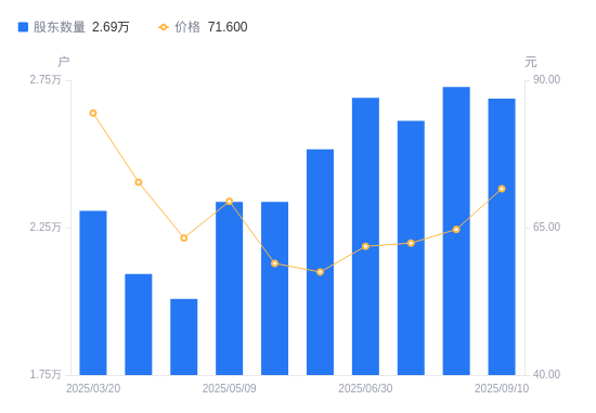日期A股户数(户)流通A股户均持股数(股)户均持股市值(万元)2025-09-10268712386.2717.092025-08-08272732351.1015.212025-07-31261242454.5015.312025-06-30269072383.0814.732025-06-20251542549.1514.652025-05-30233732743.4016.172025-05-09233722743.5219.062025-04-18200833192.8220.192025-03-31209253064.3522.282025-03-20230702779.4323.46