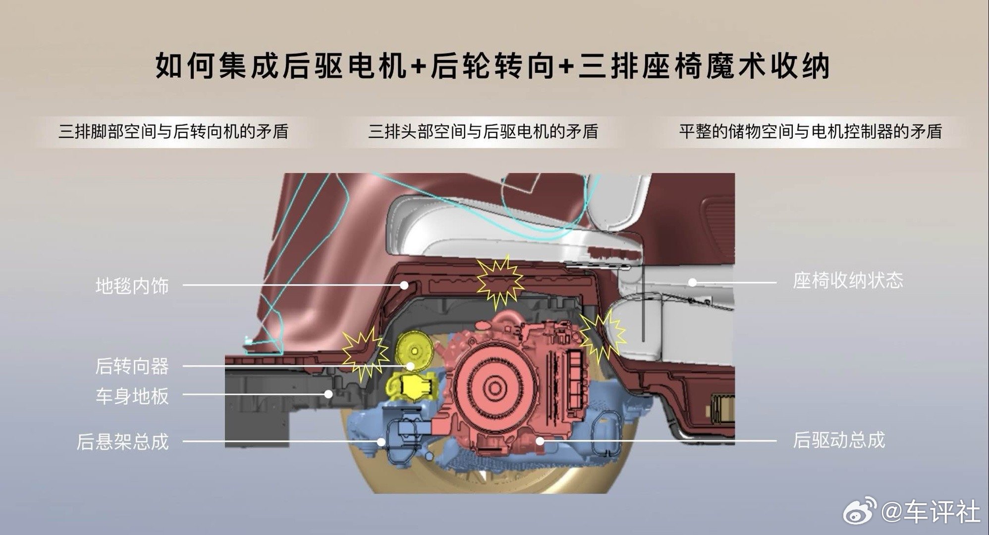小鹏X9在X向最窄仅有600mm的狭小空间里,同时布置了全铝H臂,后轮转向,同轴电驱,双腔空悬,配合一体化铝压铸的后地板,创新性实现了“五合一超集成后桥”,既满足了第三排座椅的收纳全平,也保障了第三排乘员的头部和脚部空间。