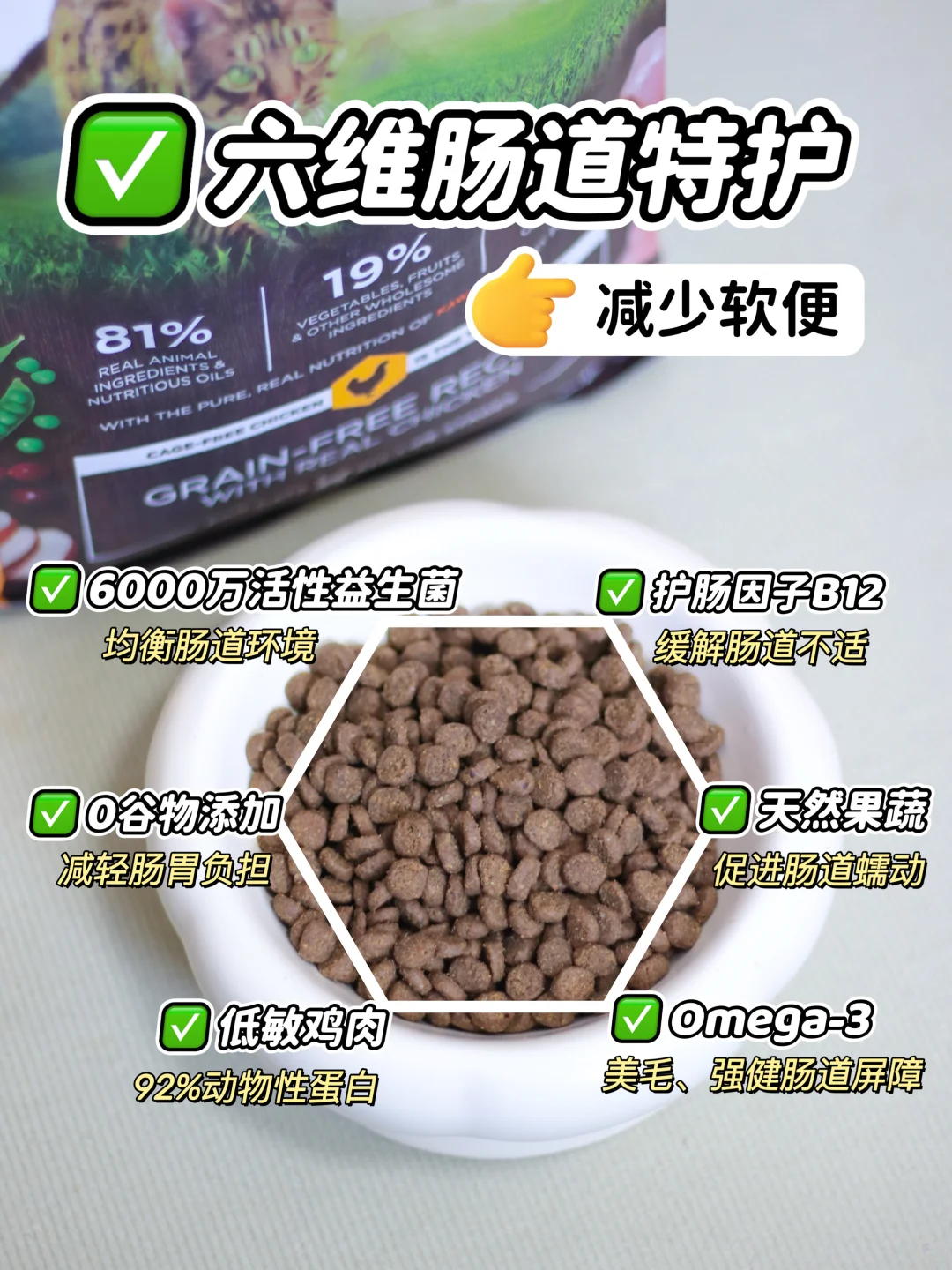 我也是尽职尽责滴潜心研究了一阵子,天然百利这款无谷鸡猫粮简直是为咱们咪量身定做!6 维肠胃特护 + 高营养buff不玩虚的,全靠成分和效果说话: