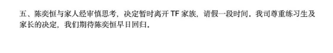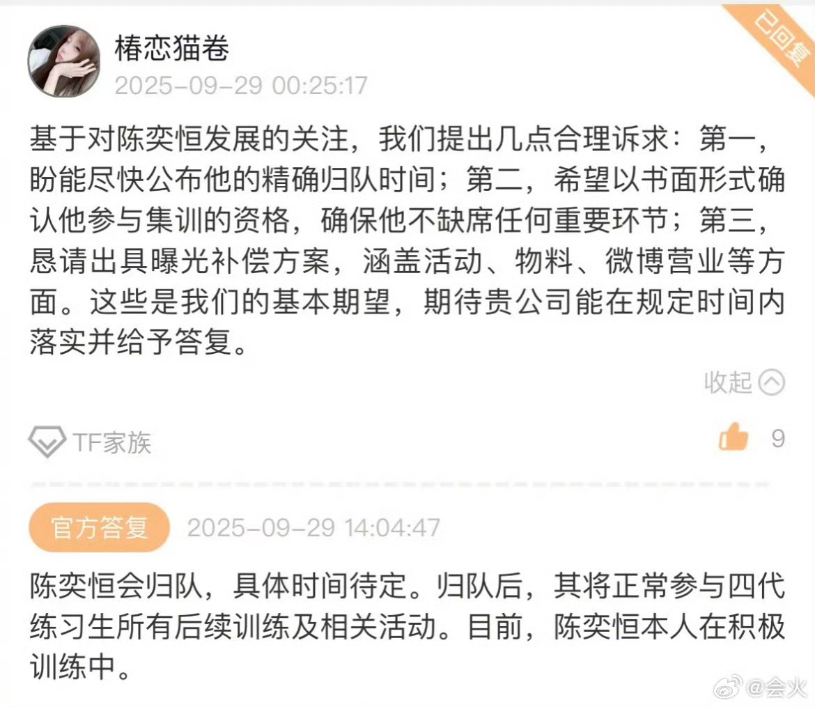 时代峰峻回应了粉丝对陈奕恒后续发展的询问表示陈奕恒会归队,具体时间待定,归队后将正常参与四代练习生的所有相关活动。目前,陈奕恒本人正在积极训练中。孩子结束假期就可以回归啦!时代峰峻回应陈奕恒归队时间