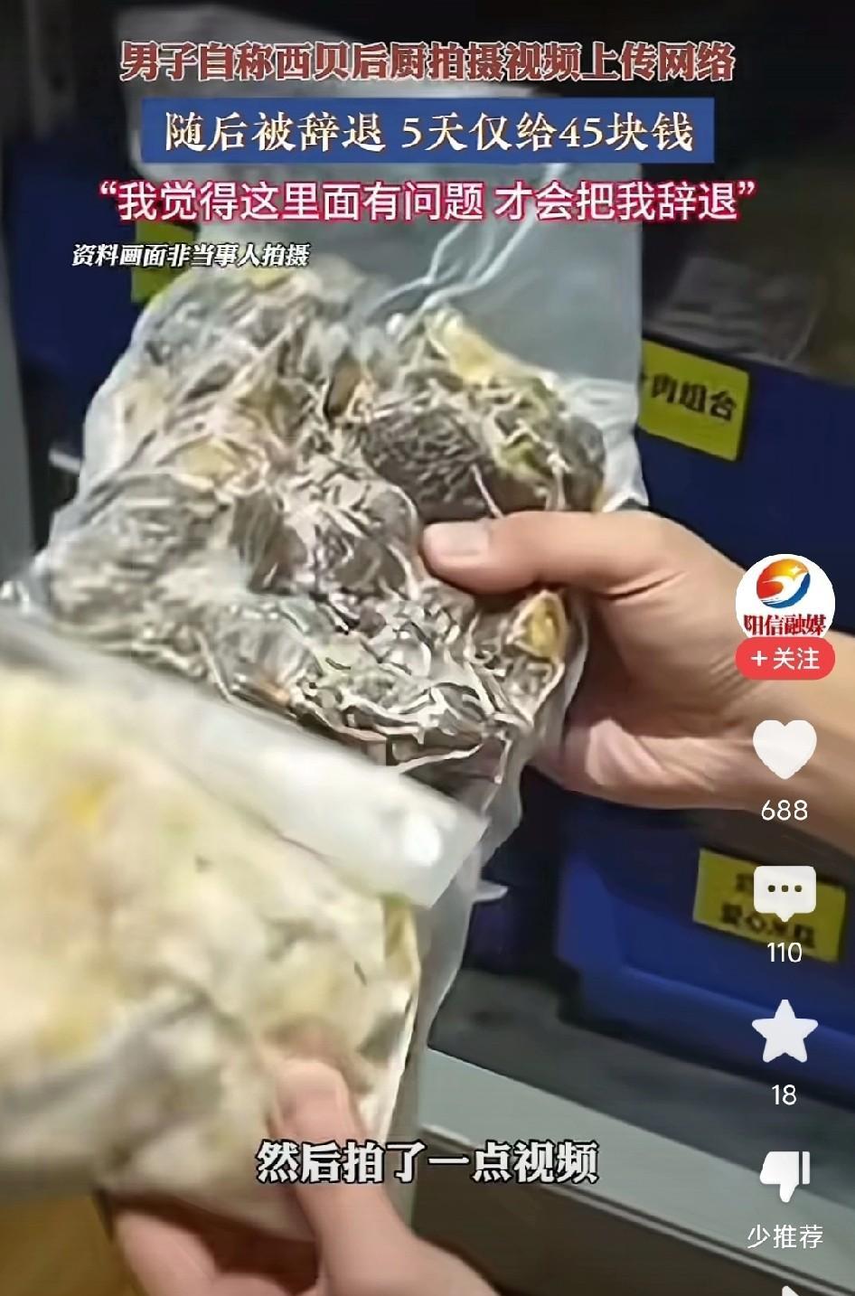 员工真人出镜吐槽西贝餐厅?一名西贝员工被炒鱿鱼,称仅获45元赔偿,原因引发争议。 我看到该视频来自9月29日的《阳信融媒》,视频里是个年轻小伙子,长得有点像乒乓球运动员马龙,模样挺英俊,不过他所说的内容让人难以置信。 他自称是西贝员工,上班时拍了些厨房视频,就被西贝解雇,只拿到45元赔偿。 谈及动机,他表示觉得西贝的做法不利于健康,所以想曝光。 当然,事情真相如何,目前还不得而知。但被解雇只赔45块钱,着实匪夷所思。解雇员工哪有这么儿戏,恐怕没那么简单。 有网友说,给45块钱坐车费算不错了,身为西贝员工,做出不利于公司的事,就该被炒。 也有人说,他想曝光厨房情况,让大众了解真相,是正义的化身。 我认为,此事不能一概而论。他拍厨房视频,究竟是想曝光问题还是蹭流量,很难说清,恐怕只有他自己清楚。 不过,西贝的做法也令人怀疑。如此轻易解雇员工,不走流程,赔45块钱是什么意思?若员工有错,可不赔偿;若员工没错,45块钱赔偿也说不过去,难道连劳动法都不懂? 大家觉得这件事可信度有多高?你怎么看?