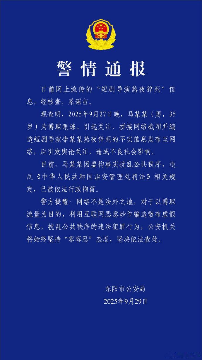 9月29日,@东阳公安通报:日前网上流传的“短剧导演熬夜猝死”信息,经核查,系谣言。