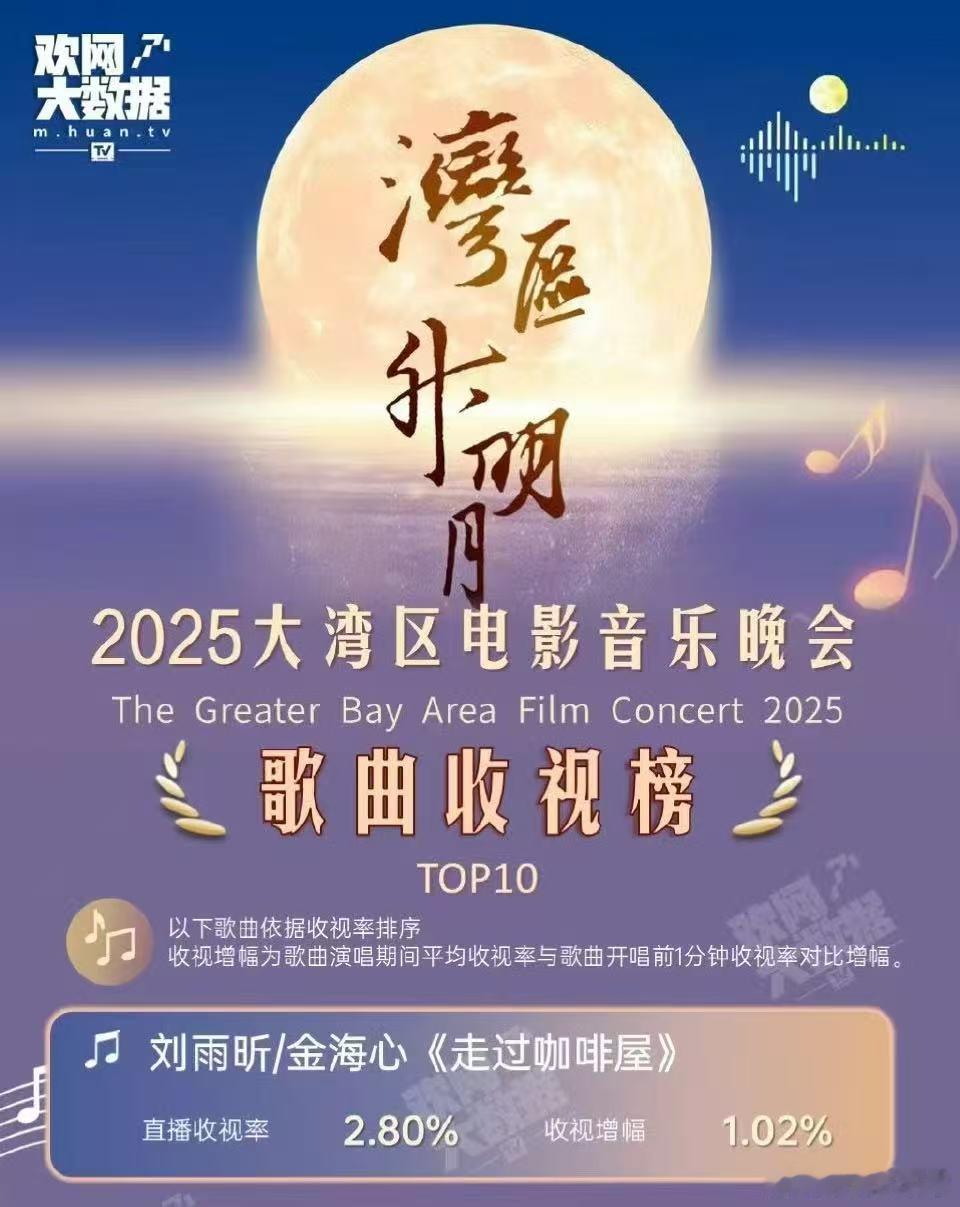 湾区升明月当晚直播收视率第一的节目刘雨昕与金海心的《走过咖啡屋》为大湾区升明月
