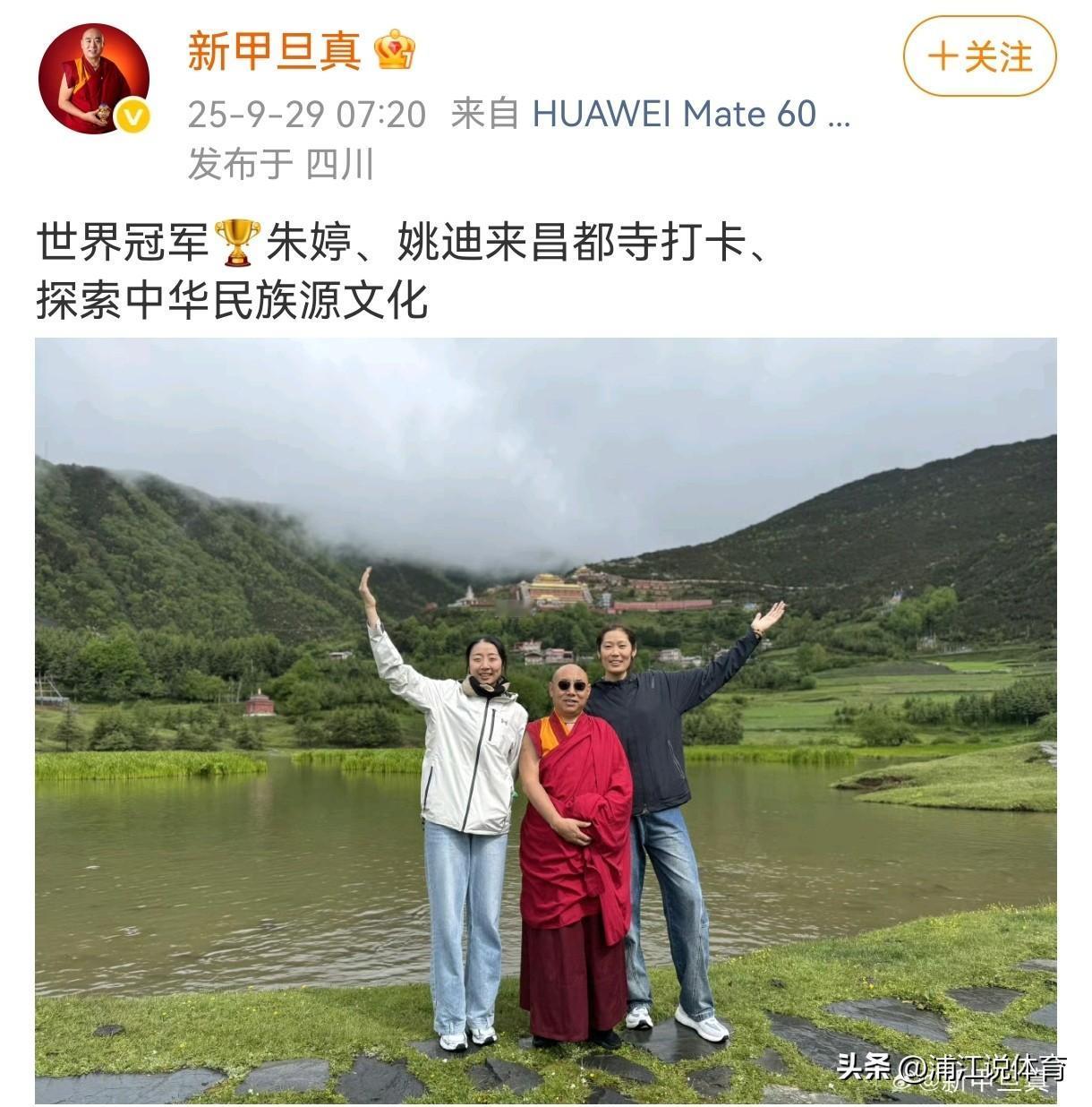 朱婷和姚迪赴川西阿坝州昌都寺“还愿”。2023年夏季,欧洲归来的朱婷与姚迪以及朱婷小妹妹朱佳荟同游川西,三人结伴同游阿坝州的昌都寺,并与昌都寺三十八世李西活佛合影留念。根据资料,昌都寺是西藏地区最古老的教派苯教的寺院,在苯教中地位显赫,而三十八世李西活佛同样地位尊贵、佛法精深。如今,朱婷妹妹朱佳荟已经入读浙大,而姚迪也成功入职天津大学体育部,朱婷则以主力身份打了巴黎奥运会并得到意甲劲旅的合约,三人都拥有了崭新圆满的开始。所以,此番重游昌都寺,既是拜会老友,应该也是去“还愿”。不过朱婷已经去意甲报到,新甲旦真活佛发布的照片应该是朱婷赴意甲之前与姚迪重游昌都寺的合影。