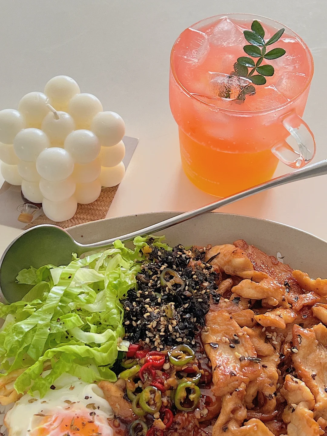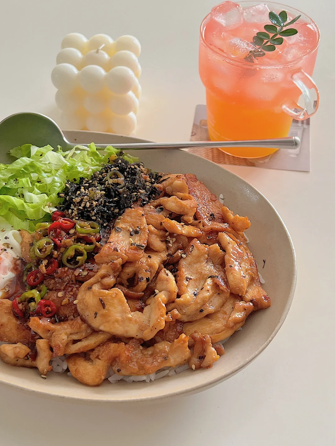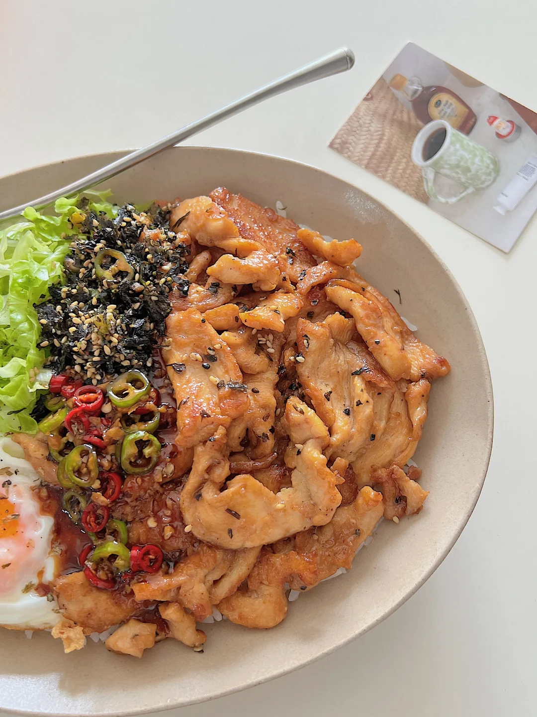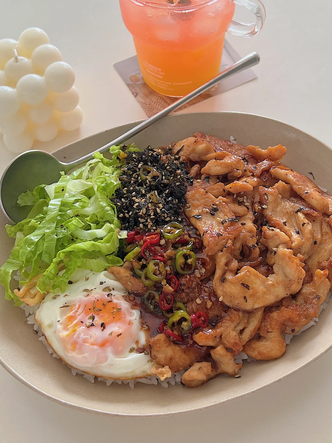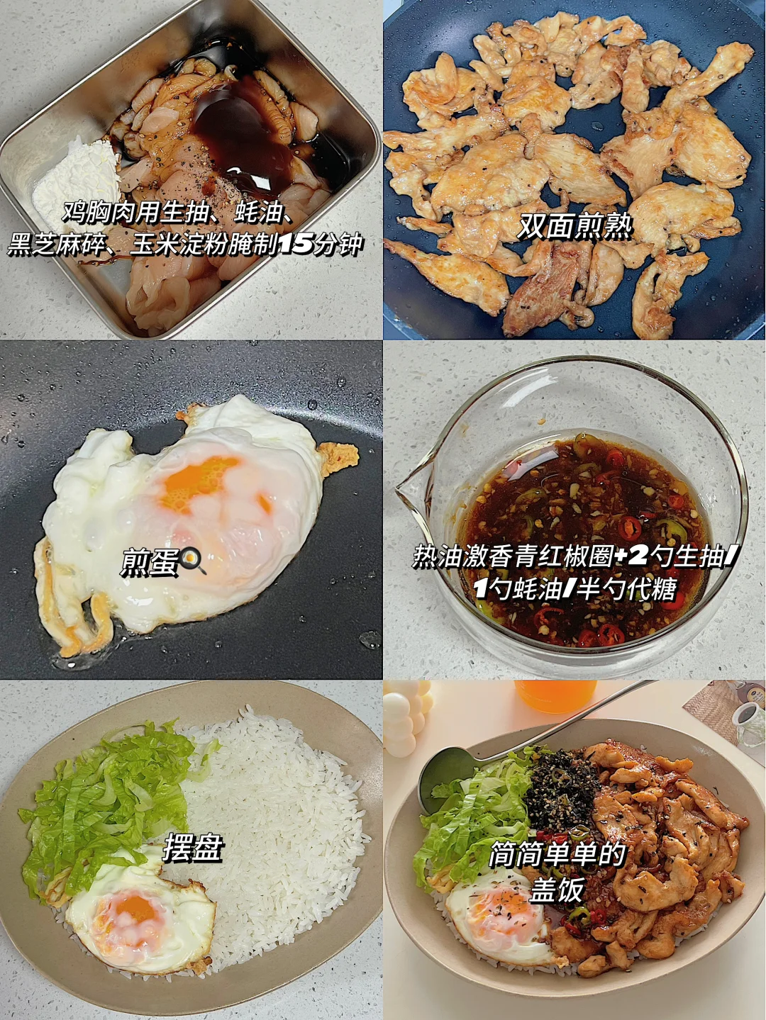 这盘盖饭不仅饱腹感超强,还能吃出高级感!鸡胸肉嫩滑多汁,生菜清脆爽口,溏心蛋的流心搭配蒜香料汁,每一口都是味蕾的享受~干净饮食也能吃得这么幸福,真的太值了!💖
