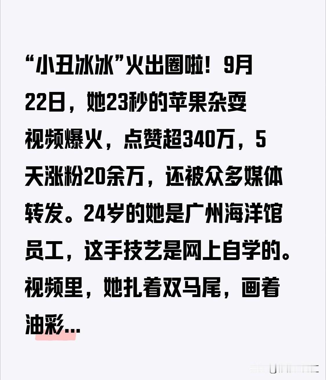 “小丑冰冰”火出圈啦!9月22日,她23秒的苹果杂耍视频爆火,点赞超340万,5天涨粉20余万,还被众多媒体转发。24岁的她是广州海洋馆员工,这手技艺是网上自学的。 视频里,她扎着双马尾,画着油彩,双手抛接苹果,还穿插咬苹果,像灵动“小馋猫”。偶尔接空吐舌,可爱满分。其实她背后很努力,最初练抛棒手砸红,练苹果每天捡几十次果子,现在一天吃10多个。她的走红带动海洋馆客流增长,“双节”还会加场。这真实又可爱的表演,谁能不爱呢?